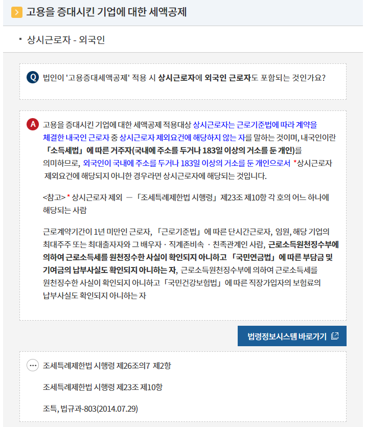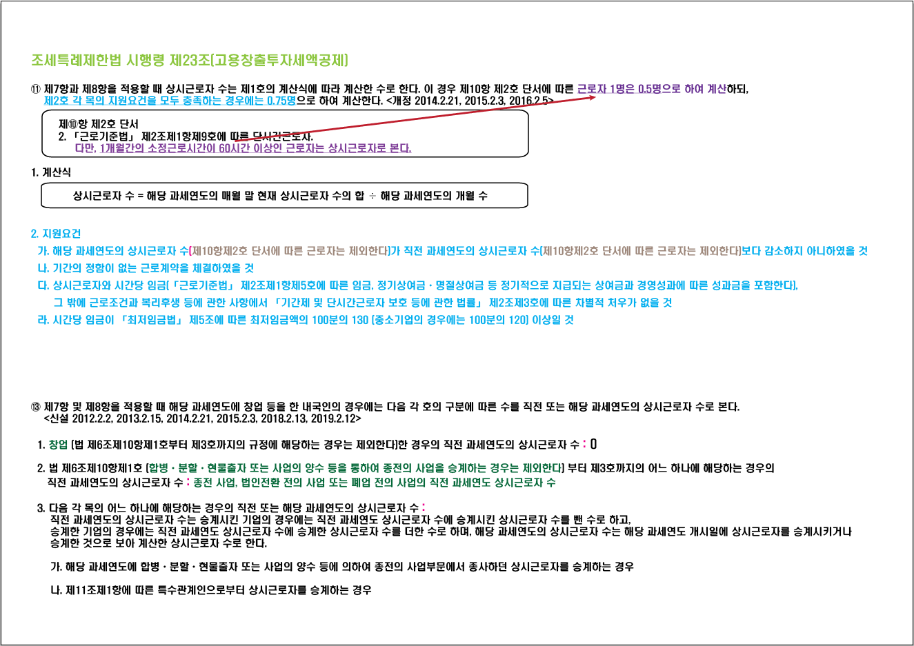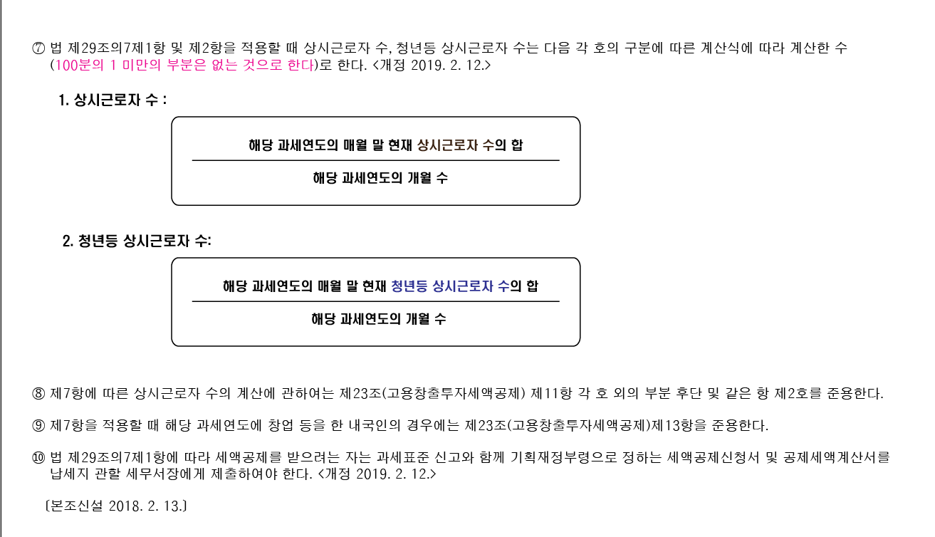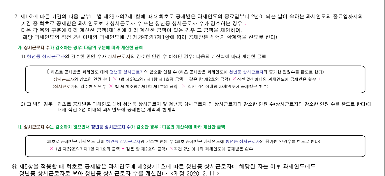 - 같은 법 시행령 제26조의 7 제5항을 적용할 때 최초로 공제받은 사업연도에 청년등 상시근로자에 해당한 자는 이후 과세연도에도 청년등 상시근로자로 보아 청년등 상시근로자 수를 계산한다.