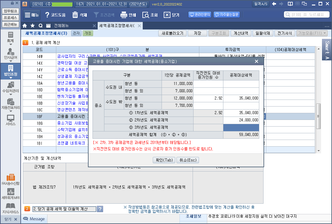 예 : 사회보험료 세액공제 + 고용증대세액공제 + 중소기업특별세액감면