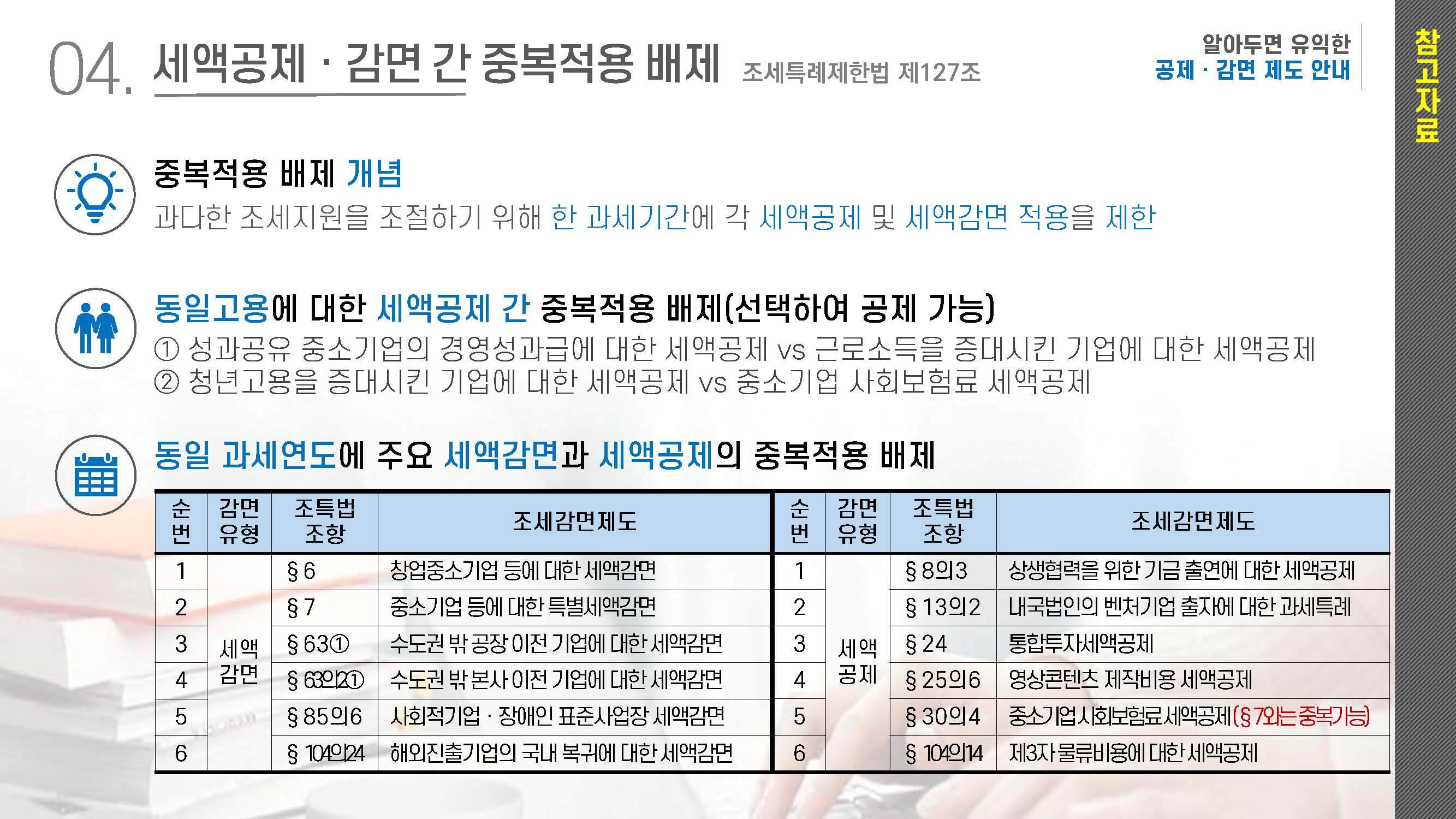 - 창업중소기업, 벤처기업 세액감면등 다른 세액감면과는 중복공제 불가하다.