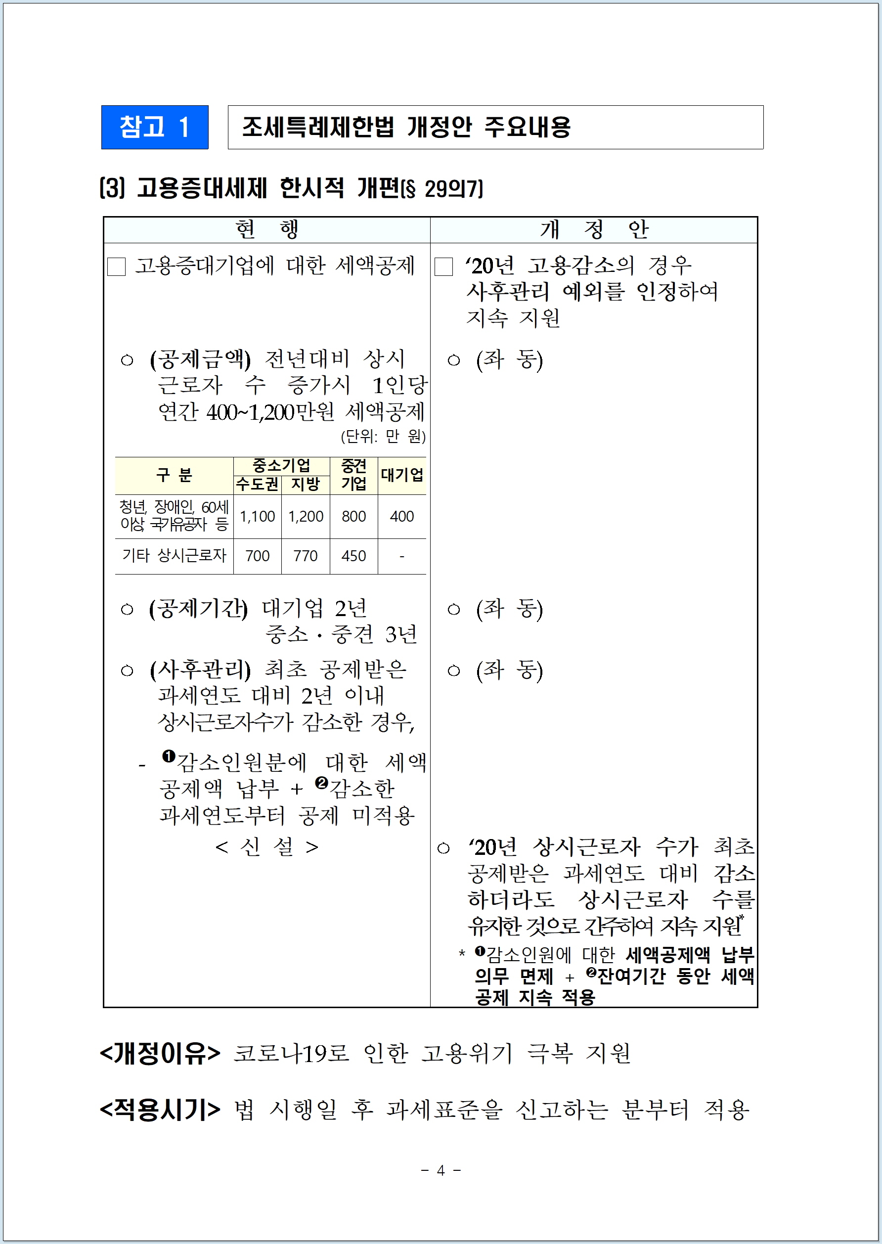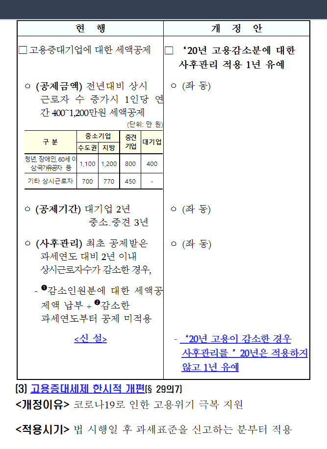 고용증대세액 추징 한시적 면제.hwp 166.00KB ➌ 코로나19에 따른 특수 상황을 감안한 고용증대세제* 한시 개편 (’21년 경제정책방향) * 전년 대비 고용증가 인원 1인당 연간 400~1,200만원(대기업: 2년간, 중소·중견기업: 3년간)소득세․법인세 세액공제 - ‘20년 고용이 감소하더라도 고용을 유지한 것으로 간주하여‘19년 고용증가에 따른세액공제 혜택 지속 적용 |