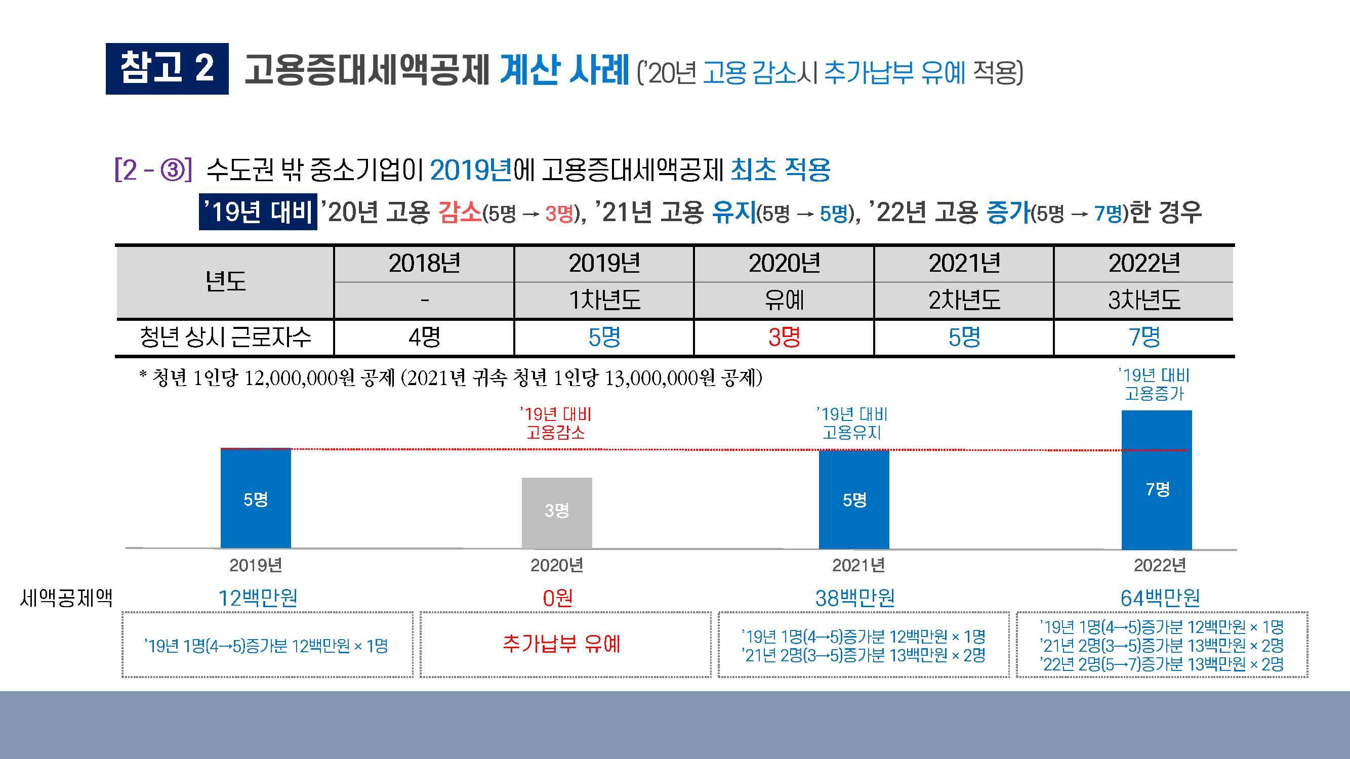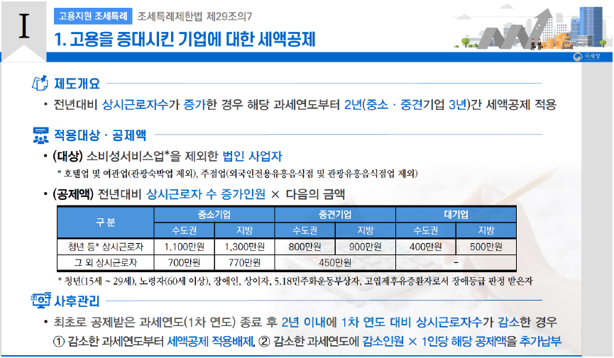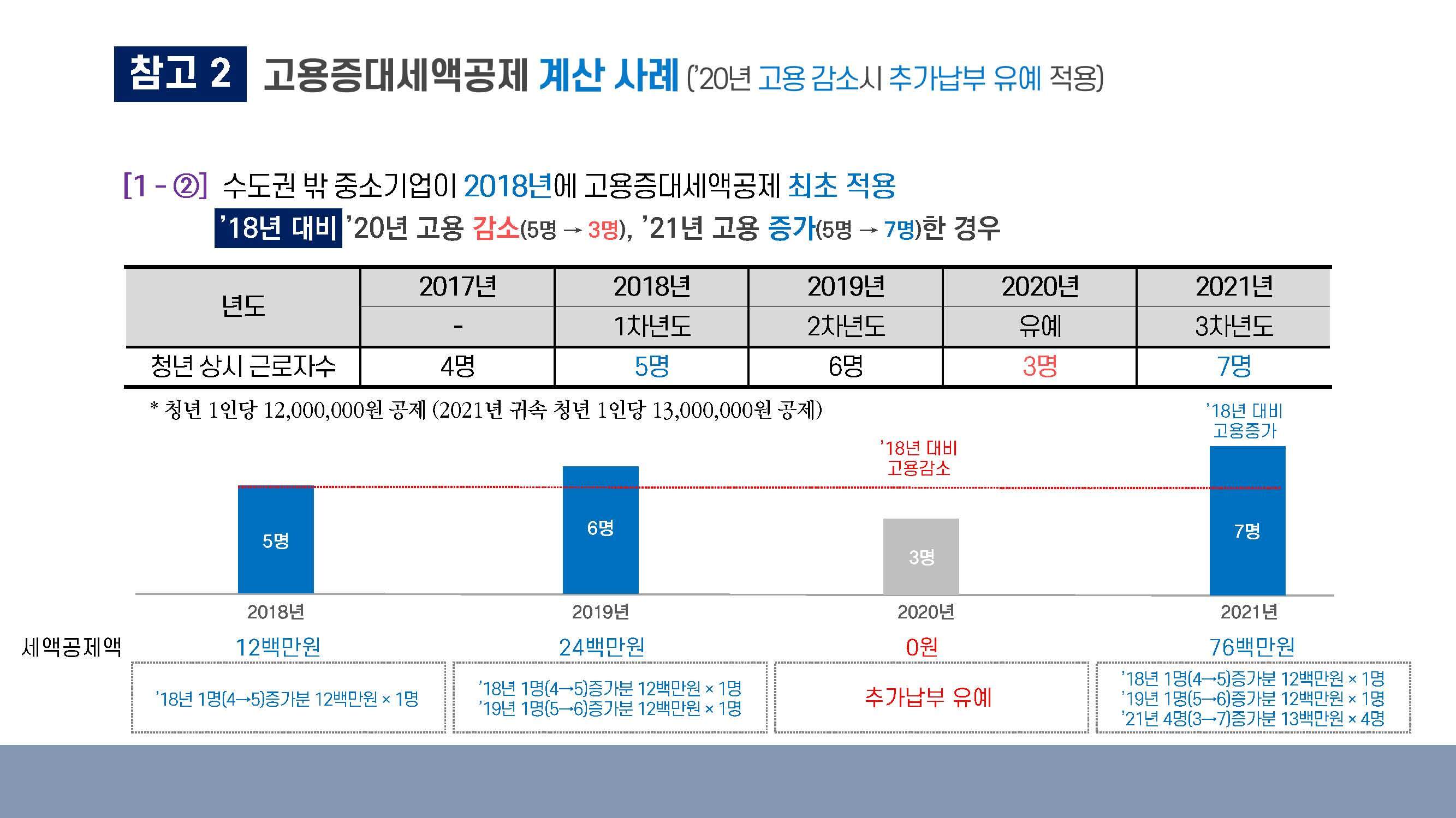 - 2018년 부터 고용인원이 감소하지 않으면 해당연도와 다음연도 (2년간) 세액공제가 적용된다.