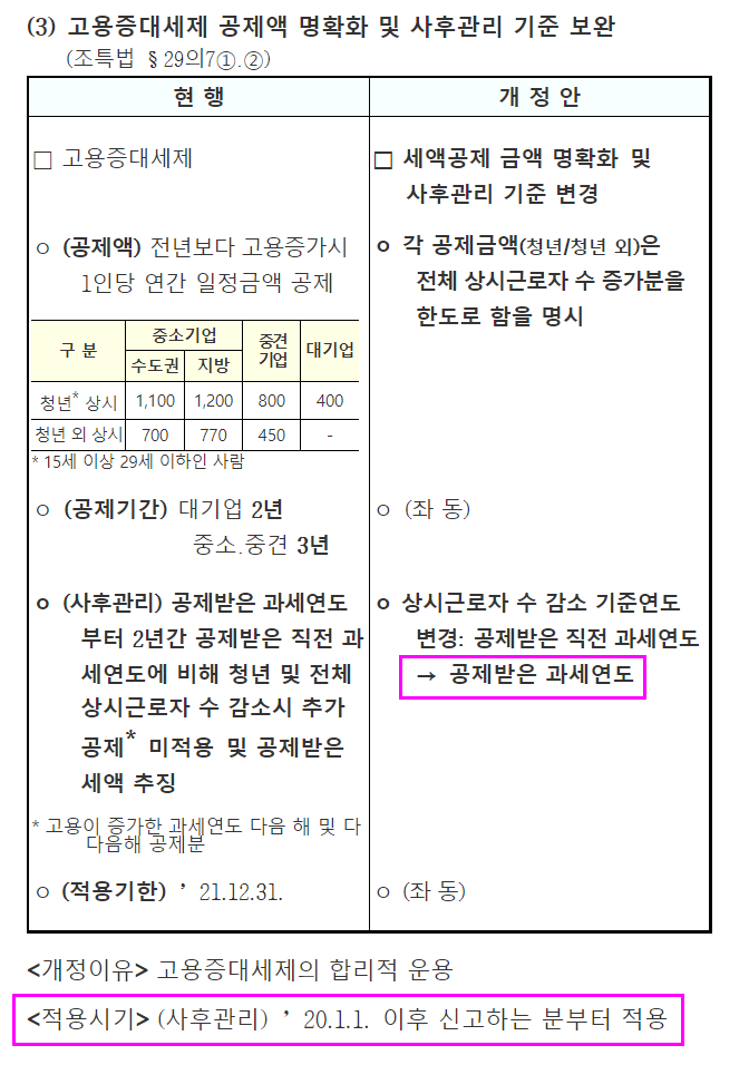 - '20년 고용이 감소한 경우 사후관리를 '20년은 적용하지 않고 1년 유예