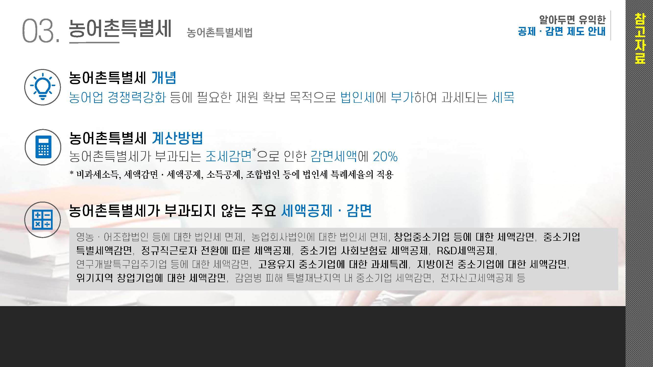 - 감가상각의제가 적용되므로 세법상 한도액까지 감가상각하여야 하며 농어촌특별세는 해당없다.