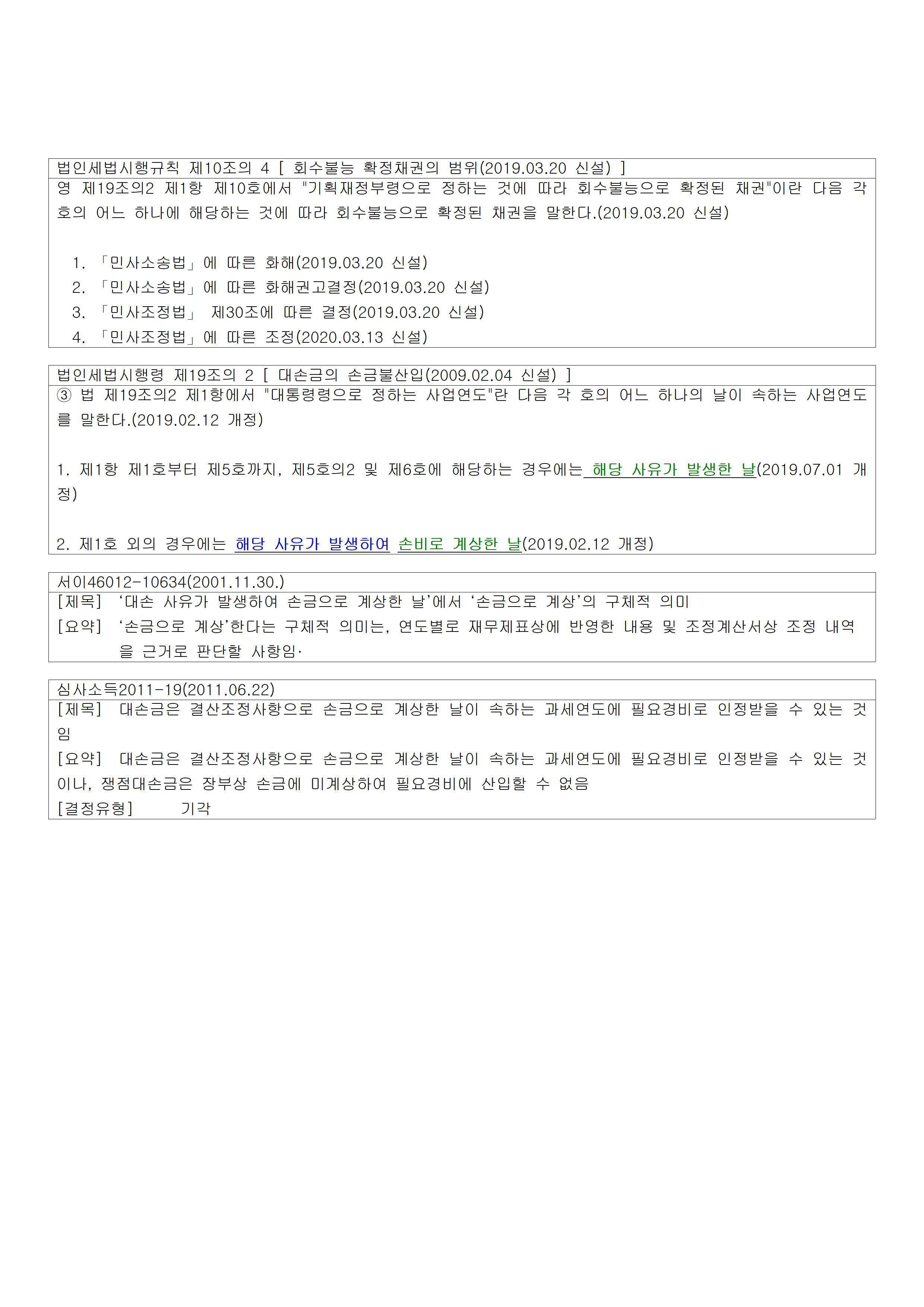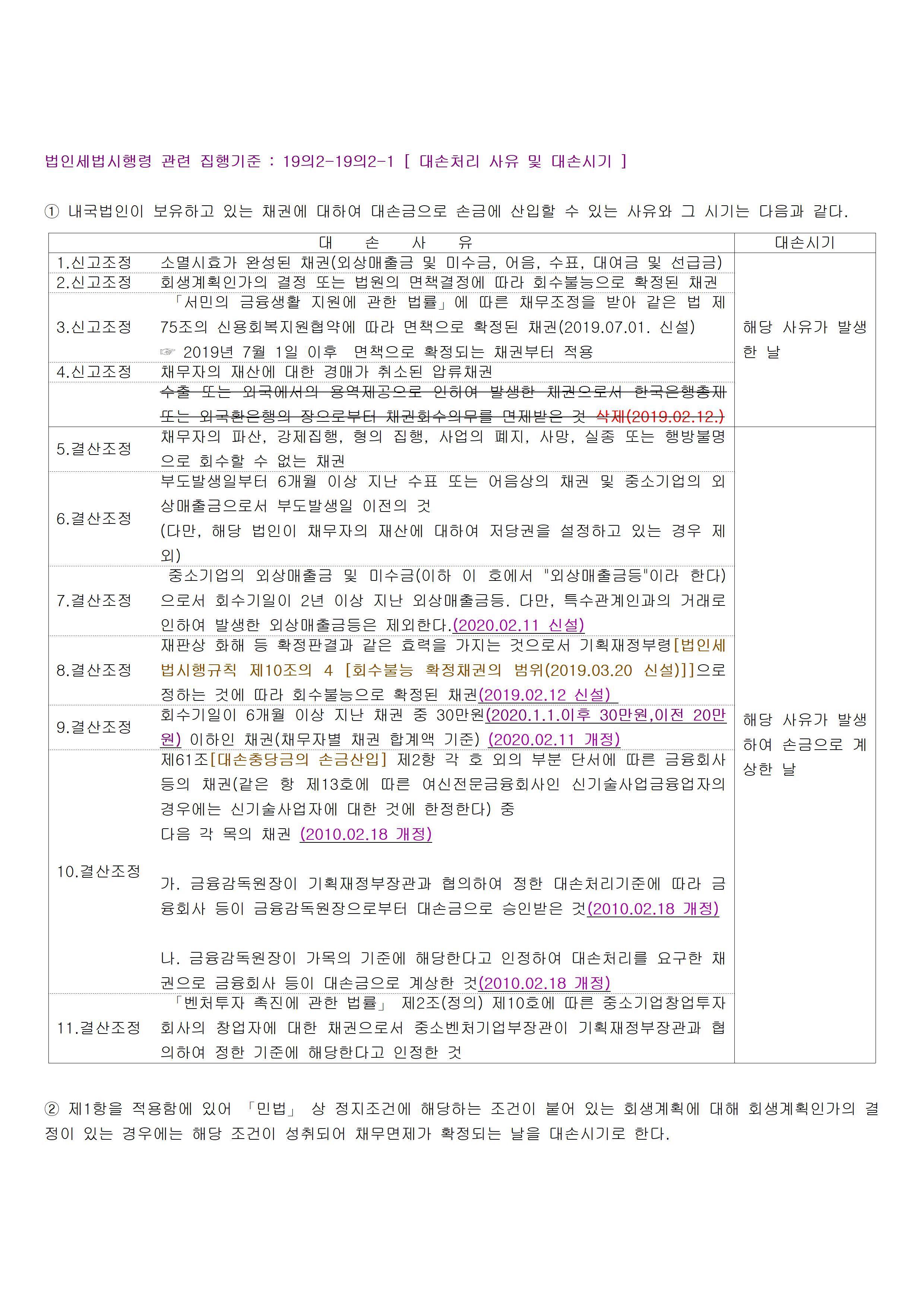| ① 법 제19조의2(대손금의 손금불산입) 제1항에서 “채무자의 파산 등 대통령령으로 정하는 사유로 회수할 수 없는 채권”이란 다음 각 호의 어느 하나에 해당하는 것을 말한다. <개정 2010. 2. 18., 2010. 12. 30., 2013. 2. 15., 2017. 7. 26., 2019. 2. 12., 2019. 7. 1., 2020. 2. 11., 2020. 8. 11., 2021. 2. 17.> 1. 「상법」에 따른 소멸시효가 완성된 외상매출금 및 미수금 - 해당 사유가 발생한 날(신고조정 가능) 2. 「어음법」에 따른 소멸시효가 완성된 어음 - 해당 사유가 발생한 날(신고조정 가능) 3. 「수표법」에 따른 소멸시효가 완성된 수표 - 해당 사유가 발생한 날(신고조정 가능) 4. 「민법」에 따른 소멸시효가 완성된 대여금 및 선급금 - 해당 사유가 발생한 날(신고조정 가능) 5. 「채무자 회생 및 파산에 관한 법률」에 따른 회생계획인가의 결정 또는 법원의 면책결정에 따라 회수불능으로 확정된 채권 - 해당 사유가 발생한 날(신고조정 가능) 5의2. 「서민의 금융생활 지원에 관한 법률」에 따른 채무조정을 받아 같은 법 제75조의 신용회복지원협약에 따라 면책으로 확정된 채권 - 해당 사유가 발생한 날(신고조정 가능) 6. 「민사집행법」 제102조에 따라 채무자의 재산에 대한 경매가 취소된 압류채권 - 해당 사유가 발생한 날(신고조정 가능) 7. 물품의 수출 또는 외국에서의 용역제공으로 발생한 채권으로서 기획재정부령으로 정하는 사유에 해당하여 무역에 관한 법령에 따라 「무역보험법」 제37조에 따른 한국무역보험공사로부터 회수불능으로 확인된 채권 → 손비로 계상한 날 (결산조정) 8. 채무자의 파산, 강제집행, 형의 집행, 사업의 폐지, 사망, 실종 또는 행방불명으로 회수할 수 없는 채권 → 손비로 계상한 날 (결산조정) 9. 부도발생일부터 6개월 이상 지난 수표 또는 어음상의 채권 및 외상매출금[중소기업의 외상매출금으로서 부도발생일 이전의 것에 한정한다]. 다만, 해당 법인이 채무자의 재산에 대하여 저당권을 설정하고 있는 경우는 제외한다. → 손비로 계상한 날 (결산조정) 9의2. 중소기업의 외상매출금 및 미수금(이하 이 호에서 “외상매출금등”이라 한다)으로서 회수기일이 2년 이상 지난 외상매출금등. 다만, 특수관계인과의 거래로 인하여 발생한 외상매출금등은 제외한다. → 손비로 계상한 날 (결산조정) https://sootax.co.kr/4946 10. 재판상 화해 등 확정판결과 같은 효력을 가지는 것으로서 기획재정부령으로 정하는 것에 따라 회수불능으로 확정된 채권 → 손비로 계상한 날 (결산조정) 11. 회수기일이 6개월 이상 지난 채권 중 채권가액이 30만원 이하(채무자별 채권가액의 합계액을 기준으로 한다)인 채권 → 손비로 계상한 날 (결산조정) 12. 제61조제2항 각 호 외의 부분 단서에 따른 금융회사 등의 채권(같은 항 제13호에 따른 여신전문금융회사인 신기술사업금융업자의 경우에는 신기술사업자에 대한 것에 한정한다) 중 다음 각 목의 채권 → 손비로 계상한 날 (결산조정) 가. 금융감독원장이 기획재정부장관과 협의하여 정한 대손처리기준에 따라 금융회사 등이 금융감독원장으로부터 대손금으로 승인받은 것 나. 금융감독원장이 가목의 기준에 해당한다고 인정하여 대손처리를 요구한 채권으로 금융회사 등이 대손금으로 계상한 것 13. 「벤처투자 촉진에 관한 법률」 제2조제10호에 따른 중소기업창업투자회사의 창업자에 대한 채권으로서 중소벤처기업부장관이 기획재정부장관과 협의하여 정한 기준에 해당한다고 인정한 것 → 손비로 계상한 날 (결산조정) ② 제1항제9호에 따른 부도발생일은 소지하고 있는 부도수표나 부도어음의 지급기일(지급기일 전에 해당 수표나 어음을 제시하여 금융회사 등으로부터 부도확인을 받은 경우에는 그 부도확인일을 말한다)로 한다. 이 경우 대손금으로 손비에 계상할 수 있는 금액은 사업연도 종료일 현재 회수되지 아니한 해당 채권의 금액에서 1천원을 뺀 금액으로 한다. <개정 2010. 2. 18., 2019. 2. 12.> ③ 법 제19조의2제1항에서 “대통령령으로 정하는 사업연도”란 다음 각 호의 어느 하나의 날이 속하는 사업연도를 말한다. <개정 2019. 2. 12., 2019. 7. 1.> 1. 제1항 제1호부터 제5호까지, 제5호의2 및 제6호에 해당하는 경우에는 → 해당 사유가 발생한 날(신고조정 가능) 2. 제1호 외의 경우에는 해당 사유가 발생하여 → 손비로 계상한 날(결산조정) ④ 제3항제2호에도 불구하고 법인이 다른 법인과 합병하거나 분할하는 경우로서 제1항제8호부터 제13호까지의 규정에 해당하는 대손금을 합병등기일 또는 분할등기일이 속하는 사업연도까지 손비로 계상하지 아니한 경우 그 대손금은 해당 법인의 합병등기일 또는 분할등기일이 속하는 사업연도의 손비로 한다. <개정 2019. 2. 12.> ⑤ 내국법인이 기업회계기준에 따른 채권의 재조정에 따라 채권의 장부가액과 현재가치의 차액을 대손금으로 계상한 경우에는 이를 손금에 산입하며, 손금에 산입한 금액은 기업회계기준의 환입방법에 따라 익금에 산입한다. ⑥ 법 제19조의2제2항제1호에서 “「독점규제 및 공정거래에 관한 법률」 제10조의2 각 호의 어느 하나에 해당하는 채무보증 등 대통령령으로 정하는 채무보증”이란 다음 각 호의 어