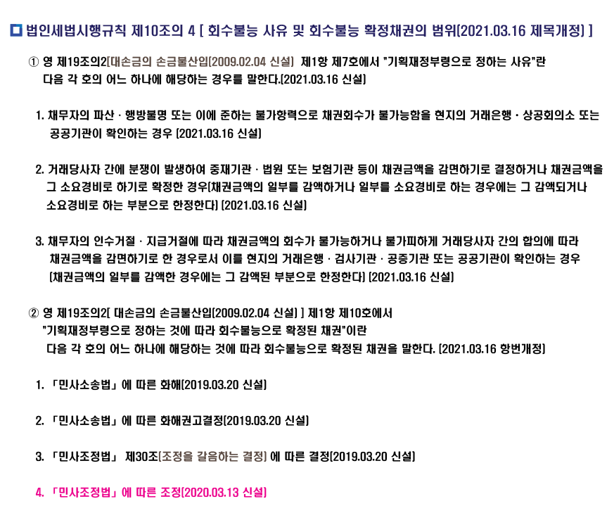 법인세법시행규칙 제10조의4 [ 회수불능 사유 및 회수불능 확정채권의 범위(2021.03.16 제목개정) ]