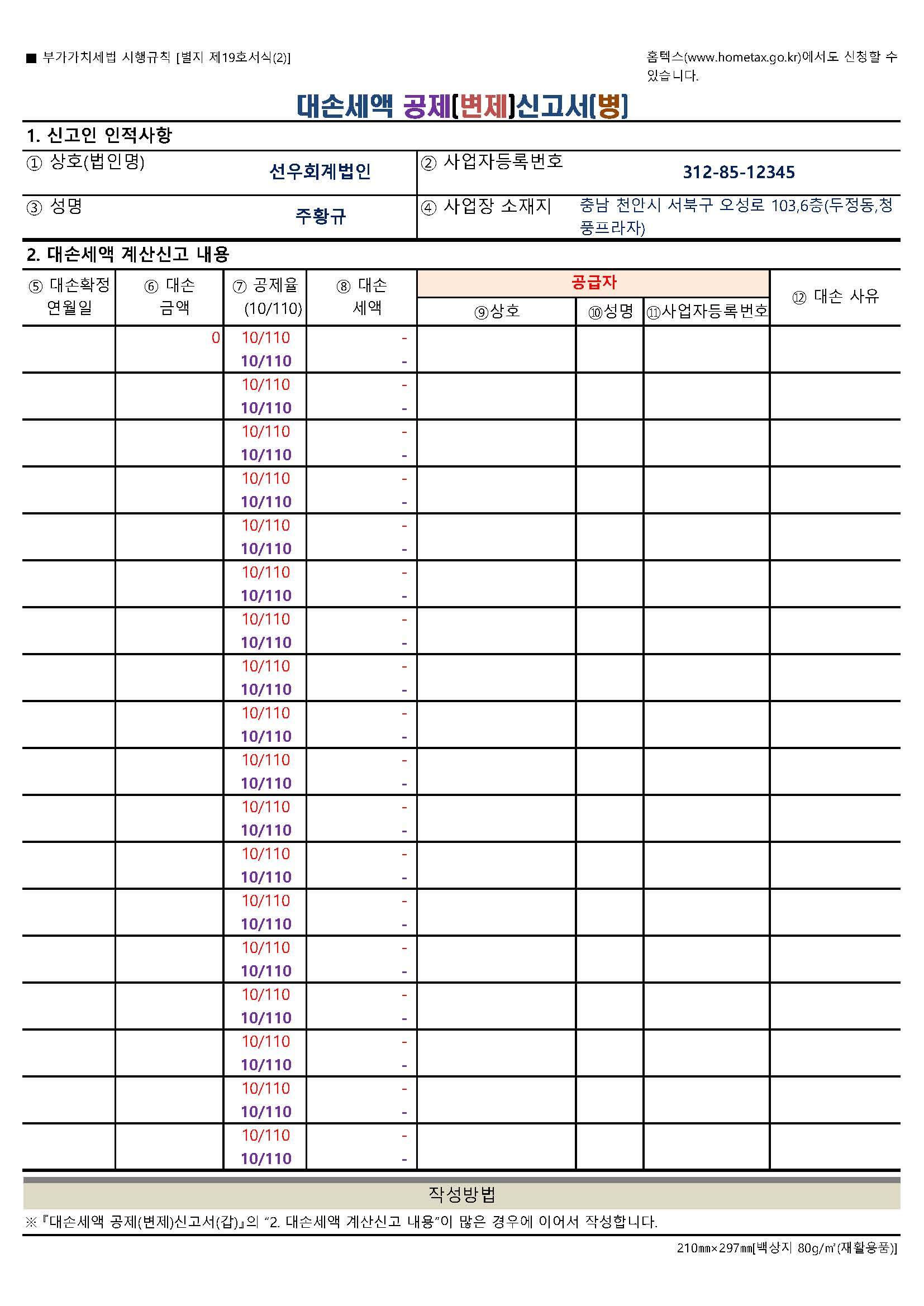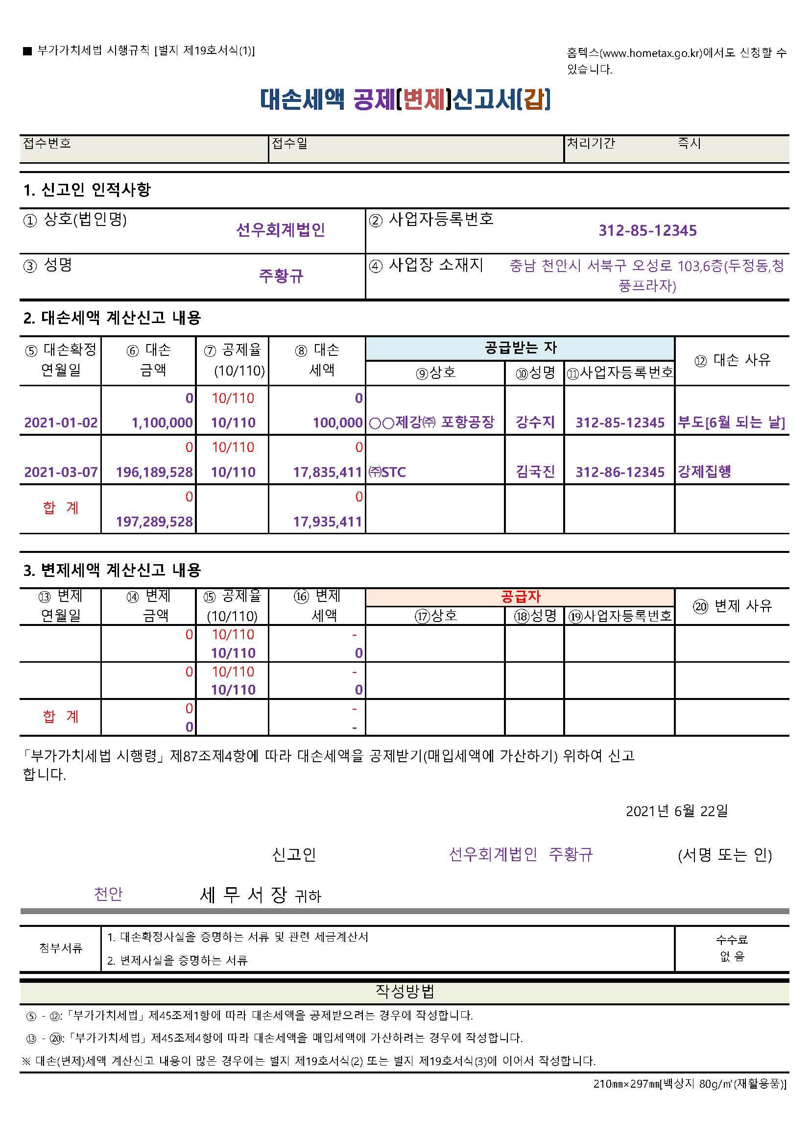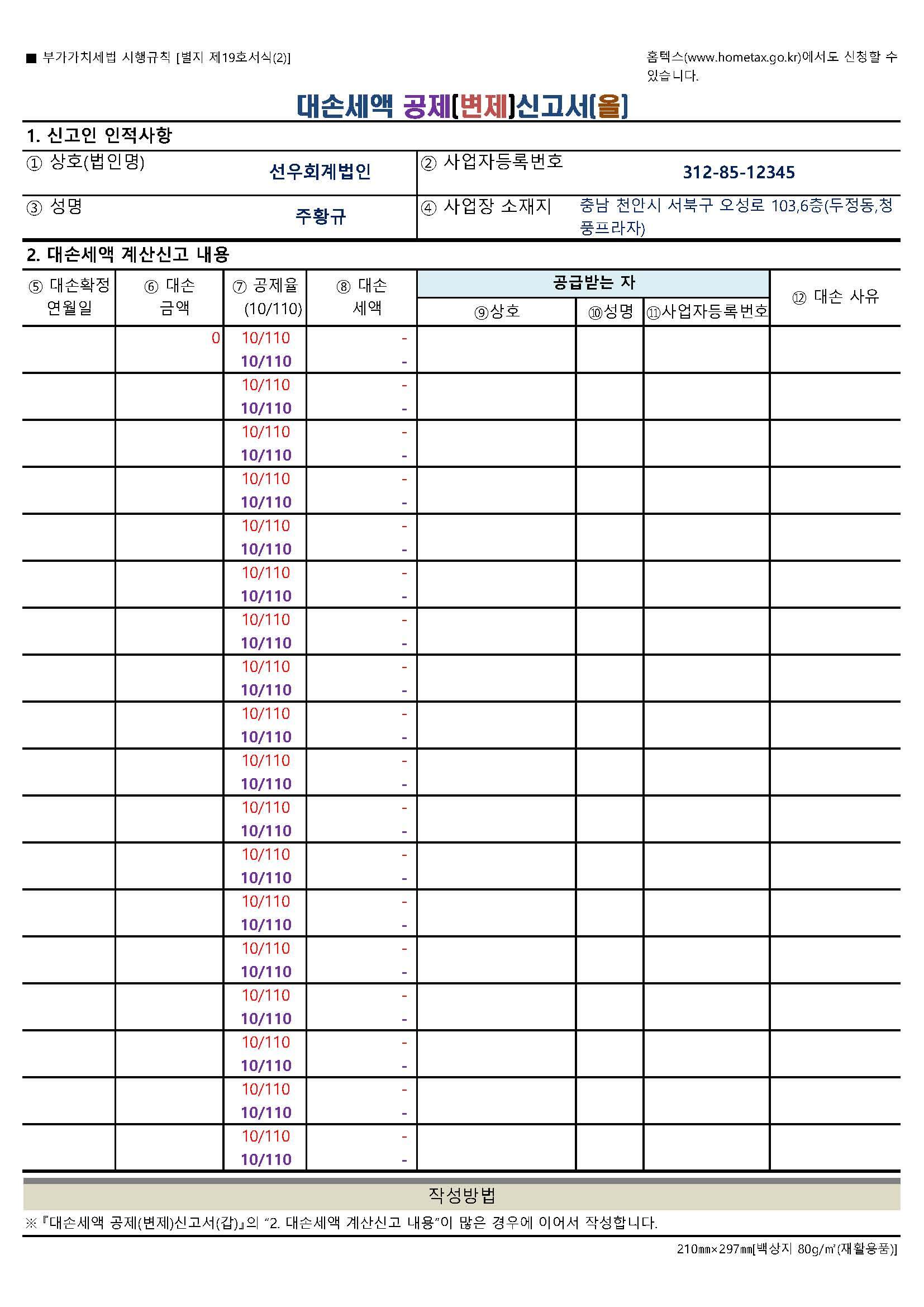 부가가치세법시행규칙 제60조 [ 대손세액 공제 및 변제 신고서 ]