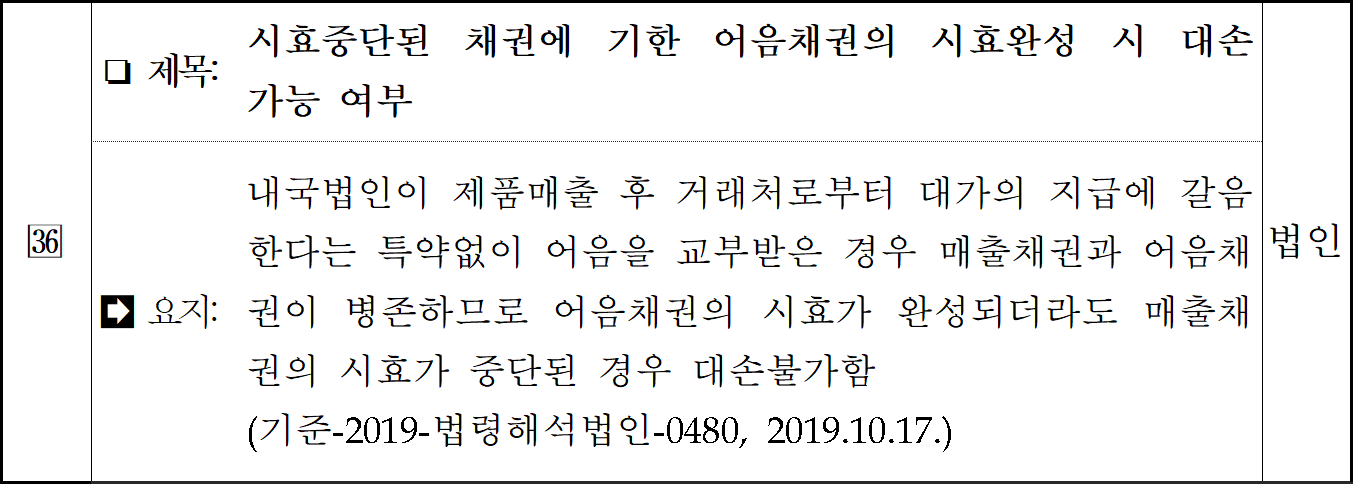 | 1. 소멸시효가 완성된 채권(외상매출금 및 미수금, 어음, 수표, 대여금 및 선급금) 2. 회생계획인가의 결정 또는 법원의 면책결정에 따라 회수불능으로 확정된 채권 3. 채무자의 재산에 대한 경매가 취소된 압류채권 4. 삭제 | 해당 사유가 발생한 날 |