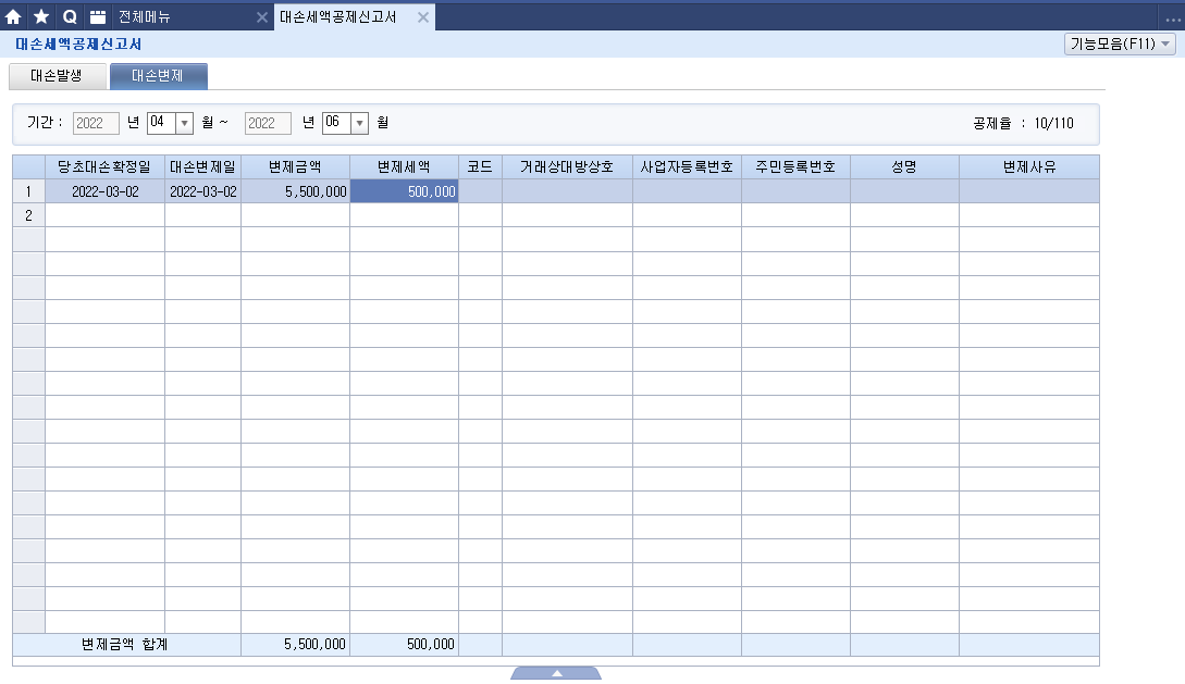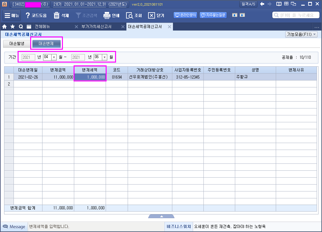 대손세액 = 대손금액 × 110분의 10
