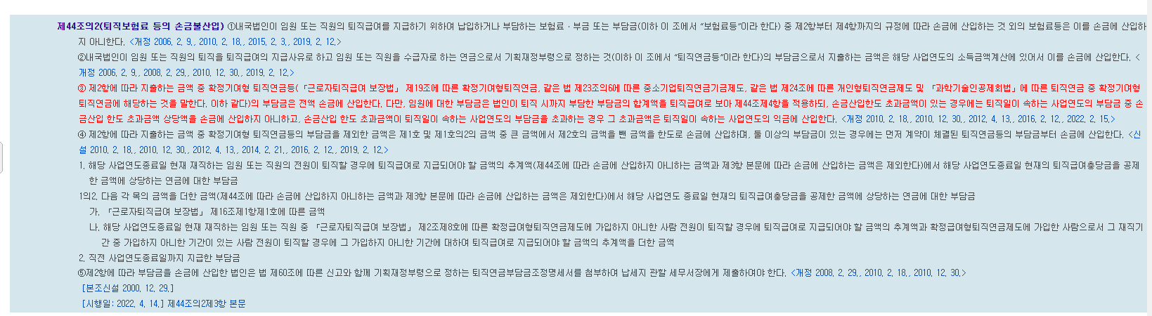 다) 「법인세법 시행령」 제44조의2(퇴직보험료 등의 손금불산입)제2항에 따른 퇴직연금등의 부담금 및 「소득세법 시행령」