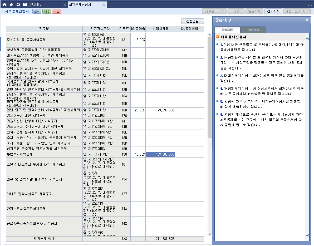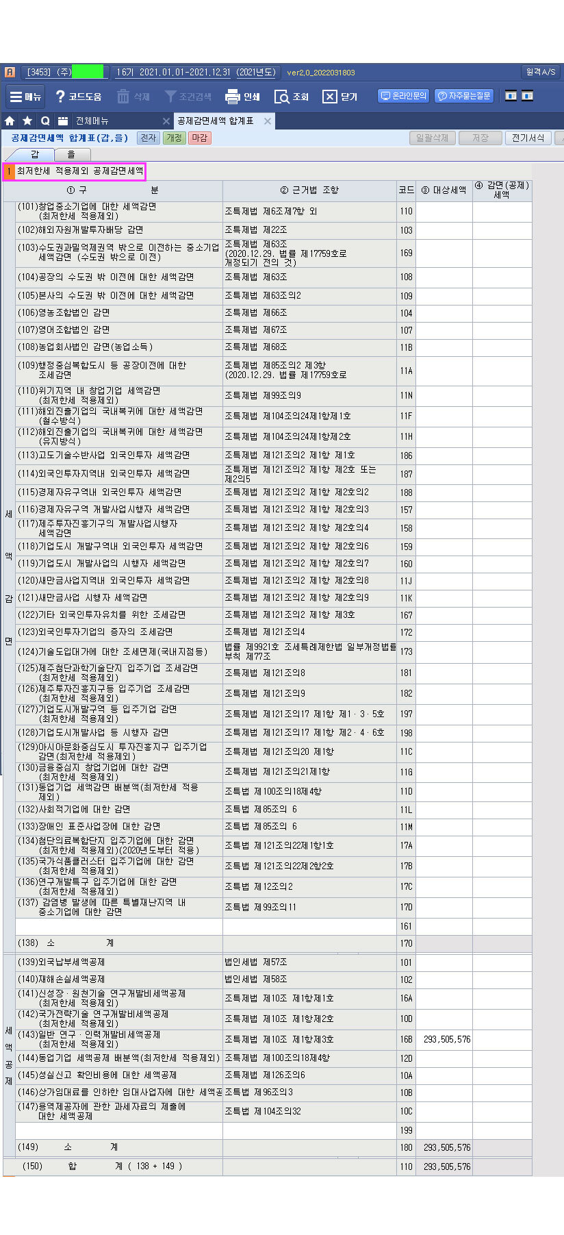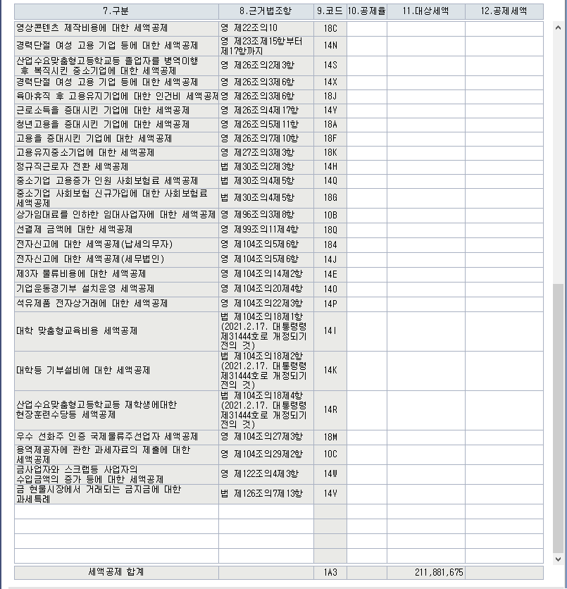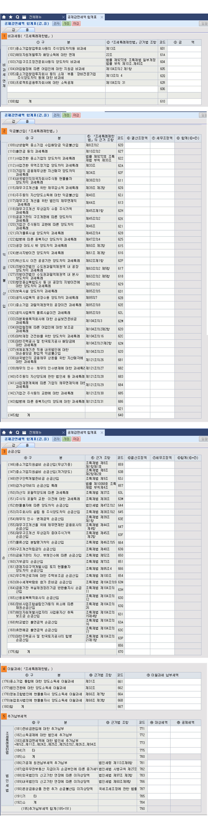 1. 최저한세 적용제외 공제감면세액 2.최저한세 적용대상 공제감면세액 작성자주황규|작성시간22.03.20|조회수444 목록 댓글 0 글자크기 작게가 글자크기 크게가 농특세농특세 농어촌특별세 감면세액 공제세액 × 20% / 최저한세 최저한세 적용제외 공제감면세액최저한세 적용대상 공제감면세액공제감면세액 합계표(갑,을) - 을 1. 비과세등 ( 「조세특례제한법」)2. 익금불산입 ( 「조세특례제한법」)3. 손금산입4. cafe.daum.net 다음검색 현재 게시글 추가 기능 열기 북마크 공유하기 신고 센터로 신고 댓글 댓글 0 댓글쓰기 답글쓰기 댓글 리스트