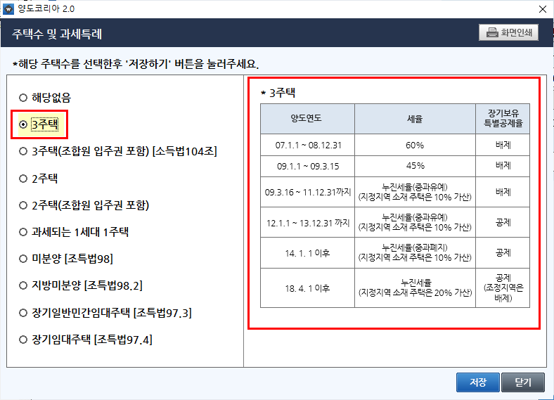 ◇ (적용시기) ‘17.8.3.이후 양도하는 주택부터 적용 5. Q%A1. 지정지역 지정일인 ‘17.8.3.이후에는 1세대 3주택자가 지정지역내 주택을 양도할 경우 일반세율(6~40%)에 10%p를 가산하는 것인지?◇ 지정지역(국토부 보도자료에는 "투지기역")에 있는 1세대3주택자의 주택은 지정지역 지정일인 ‘17.8.3.이후 양도하는분부터 일반세율(6~40%)에 10%p를 가산하여 즉시 적용 2. 지정지역내 3주택에 해당하는 주택을 2009.3.15~2012.12.31.사이에 취득하고 ‘17.8.3.이후 양도시 소법 부칙 제9270호 제14조에 따라 10%p추가과세 제외되는지?※ 소득세법 부칙 제9270호(2008.12.26) 제14조(양도소득세의 세율 등에 관한 특례) ① 2009년 3월 16일부터 2012년 12월 31일까지 취득한 자산을 양도함으로써 발생하는 소득에 대하여는 제104조제1항제4호부터 제9호까지의 규정에도 불구하고 같은 항 제1호에 따른 세율(그 보유기간이 2년 미만이면 같은 항 제2호 또는 제3호에 따른 세율)을 적용한다. ◇ 현행 지정지역 1세대3주택 중과는 「소득세법」제104조제4항의 규정이고, 「소득세법」부칙 제9270호 제14조는 「소득세법」제104조 제1항에 관한 규정이므로 1세대3주택자가 지정지역 안에 있는 주택을 2009.3.15~2012.12.31사이에 취득하였다고 하더라도 부칙 제9270호 제14조를 적용할 수 없어 10%p 추가과세 적용 3. 1세대 3주택자가 지정지역내 주택을 양도할 경우 장기보유특별공제를 적용하는 것인지?◇ 현행 소득세법 제95조제2항에서는 미등기양도자산만 장기보유특별공제를 배제하고 있으므로, 1세대 3주택자가 지정지역 안에 있는 주택 양도시 장기보유특별공제 적용 4. 이번에 지정된 지정지역 내에 있는 비사업용토지를 양도할 때에도 소득세법 제104조제4항에 따라 일반세율(6~40%)에 10%p를 가산하는지?◇ 이번에는 주택에 대해서만 지정지역을 지정하였으므로 비사업용토지 양도시 소득세법 제104조제4항을 적용하지 않음 5. 1세대 1주택 양도소득세 비과세의 거주요건이 적용되는 주택은 매수시점인지 매도시점인지?◇ 대책 발표일 다음날 이후 취득하는 조정대상지역 내 주택에 대하여 거주기간(2년 이상) 요건이 적용됨 - 대책 발표일 이전에 이미 취득한 주택은 거주기간 요건이 적용되지 않음 6. 현재 주택임대사업자 등록시 어떤 혜택이 있는지?◇ 주택임대사업자로 등록하는 경우 현재 임대주택에 대한 취득세, 재산세 등 지방세 감면 외에도 임대소득에 대한 소득세가 감면(30% 또는 75% 감면)되고, 양도소득세 감면 및 종합부동산세 합산배제 등 혜택을 적용받을 수 있음