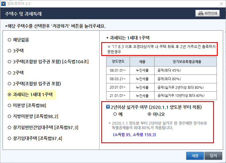 ◇ (적용시기) ‘21.1.1. 이후 양도분부터 적용 6. 조정대상지역 내 다주택자 양도소득세 중과적용 한시적 배제◇ (내용) 다주택자가 조정대상지역 내 10년 이상 보유한 주택을 양도하는 경우 한시적으로 양도소득세 중과 배제 및 장기보유특별공제 적용 ◇ (적용시기) ‘19.12.17.부터 ‘20.6.30.까지 양도하는 분에 적용 7. Q&A1. 1세대 1주택자 장기보유특별공제에 거주기간 요건을 추가 함에 따른 양도소득세부담 변동 사례◇ 양도가액 20억원, 양도차익 10억원, 10년 이상 보유한 주택