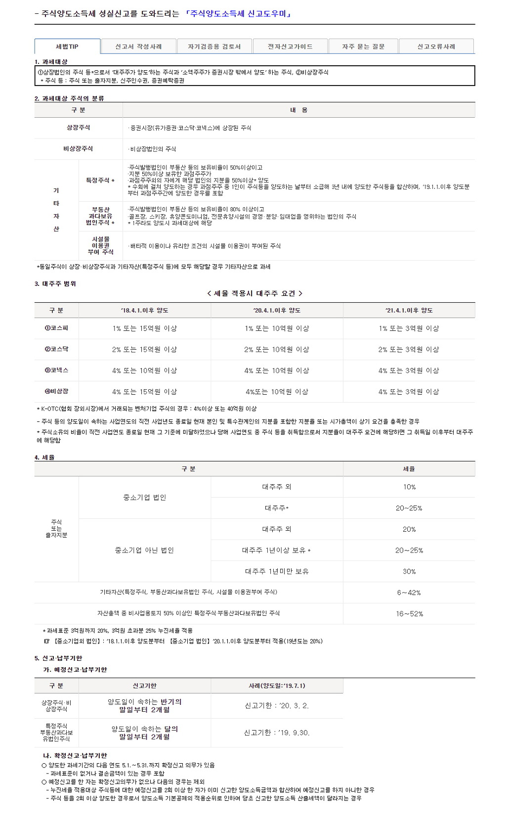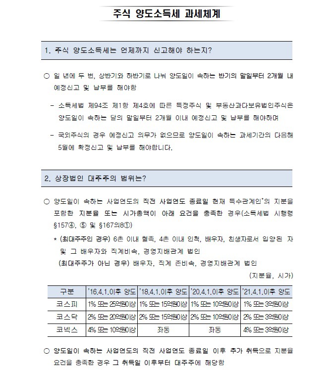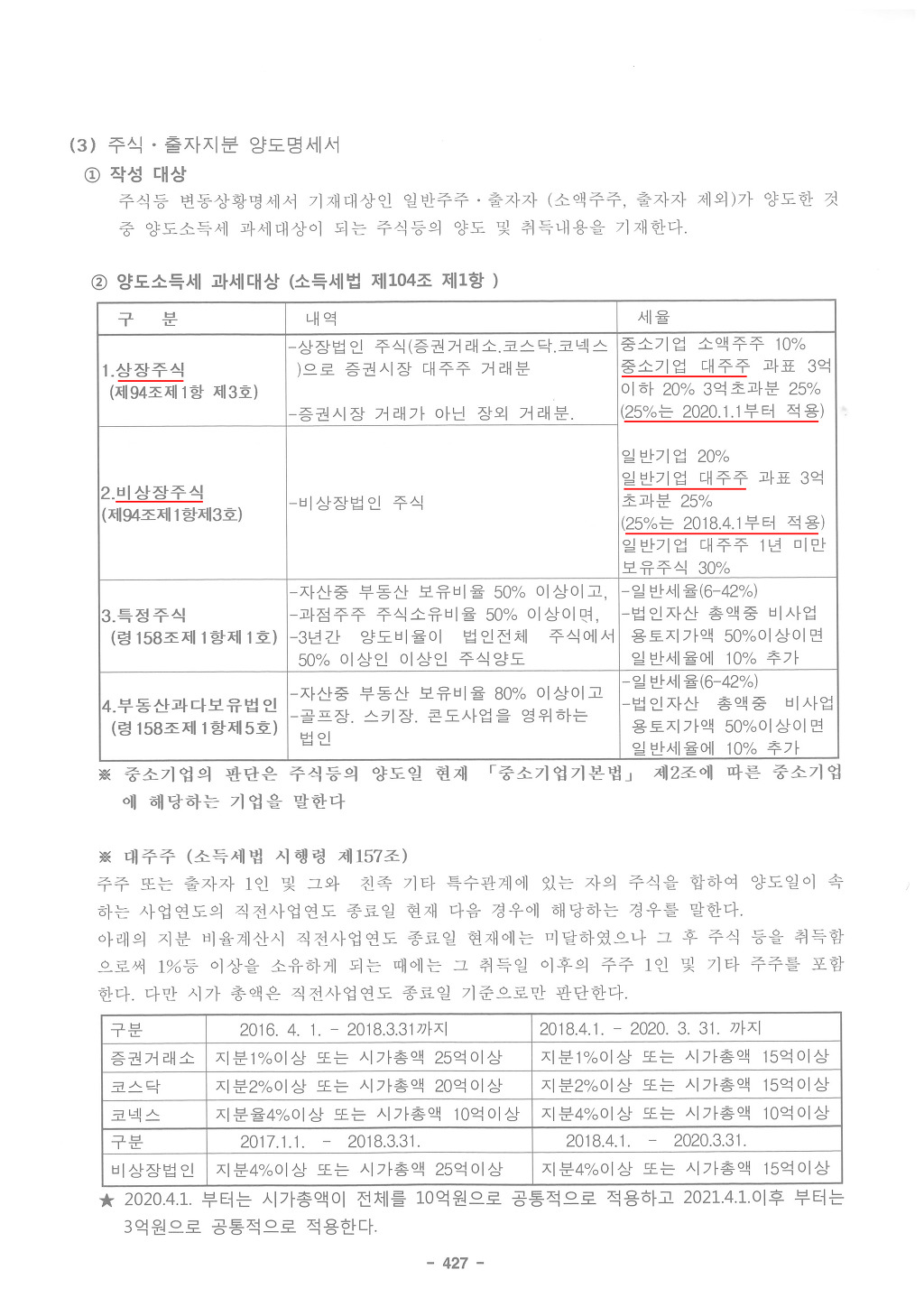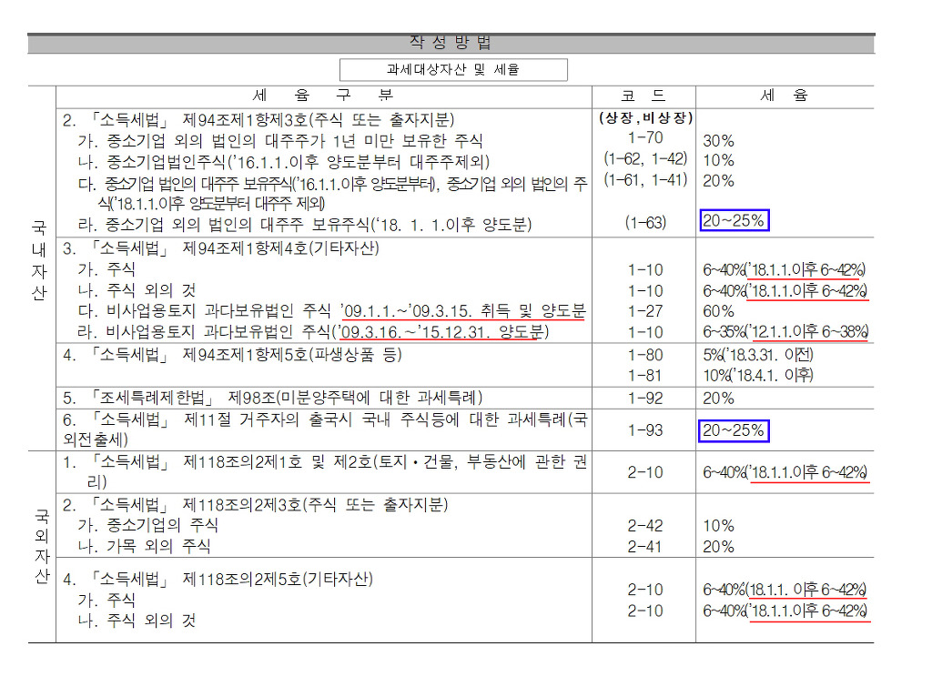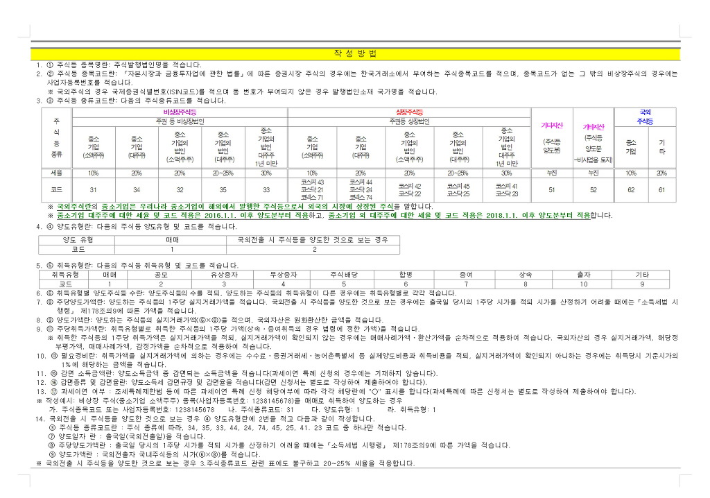 중소기업 대주주에 대한 세율 및 코드 적용은 2016.1.1. 이후 양도분부터 적용하고, 중소기업 외 대주주에 대한 세율 및 코드 적용은 2018.1.1. 이후 양도분부터 적용합니다.