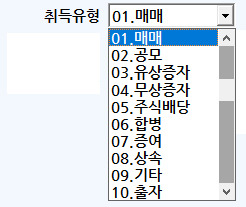 5. 취득유형란: 다음의 주식취득유형 및 코드를 적습니다.