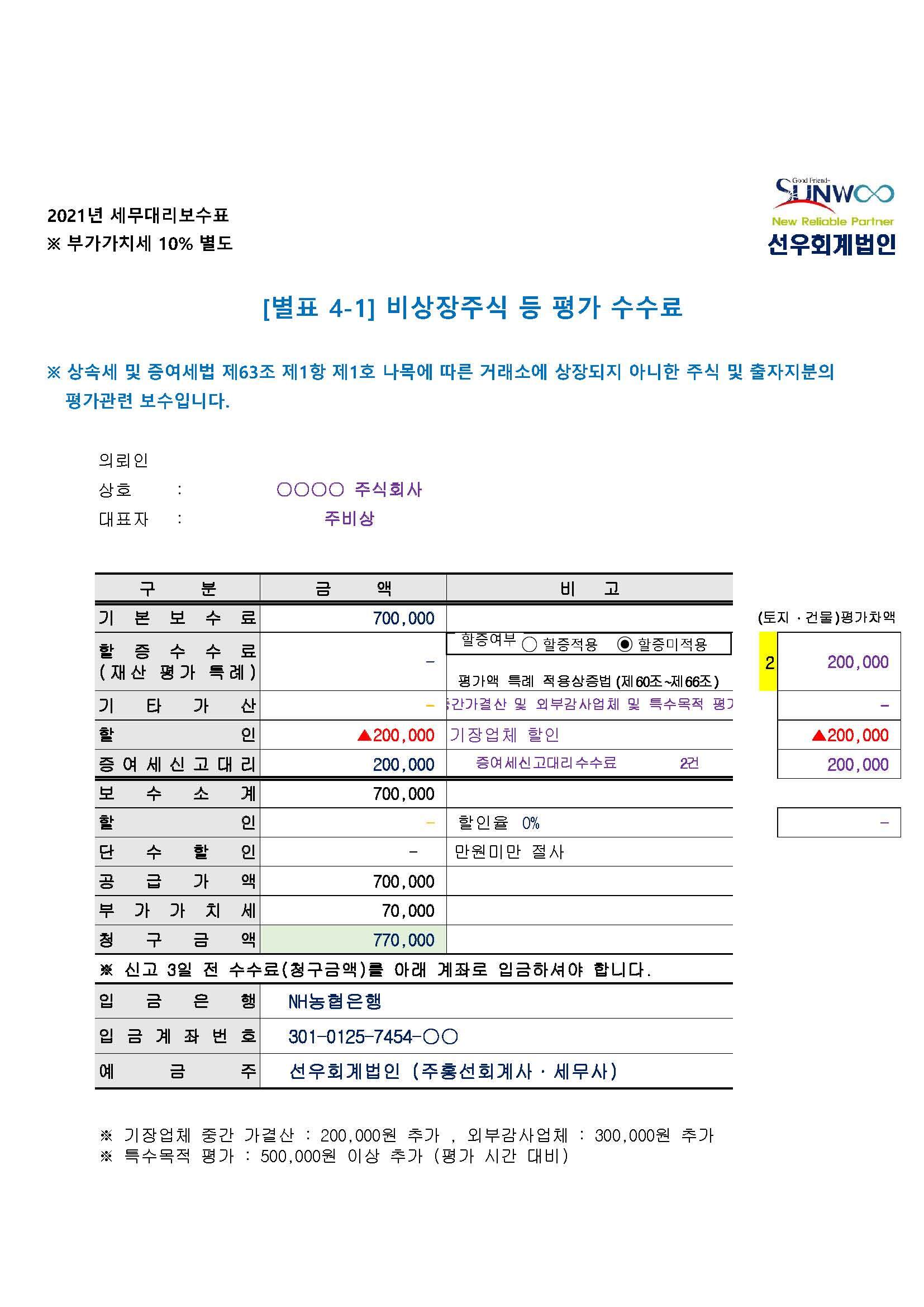 [스크랩] 비상장주식평가수수료 작성자주황규|작성시간21.05.06|조회수2,016 목록 댓글 0 글자크기 작게가 글자크기 크게가 비상장주식평가수수료 및 증여세신고대리수수료.xlsx38.81KB비상장주식평가수수료 및 증여세신고대리수수료.pdf148.32KB 첨부파일첨부된 파일이 4개 있습니다. jpg 파일 주황규.jpg 다운로드 xlsx 파일 비상장주식평가수수료 및 증여세신고대리수수료.xlsx 다운로드 pdf 파일 비상장주식평가수수료 및 증여세신고대리수수료.pdf 다운로드 jpg 파일 비상장주식평가수수료 및 증여세신고대리수수료.jpg 다운로드 다음검색 스크랩 원문 : 조세실 현재 게시글 추가 기능 열기 북마크 공유하기 신고 센터로 신고 댓글 댓글 0 댓글쓰기 답글쓰기 댓글 리스트