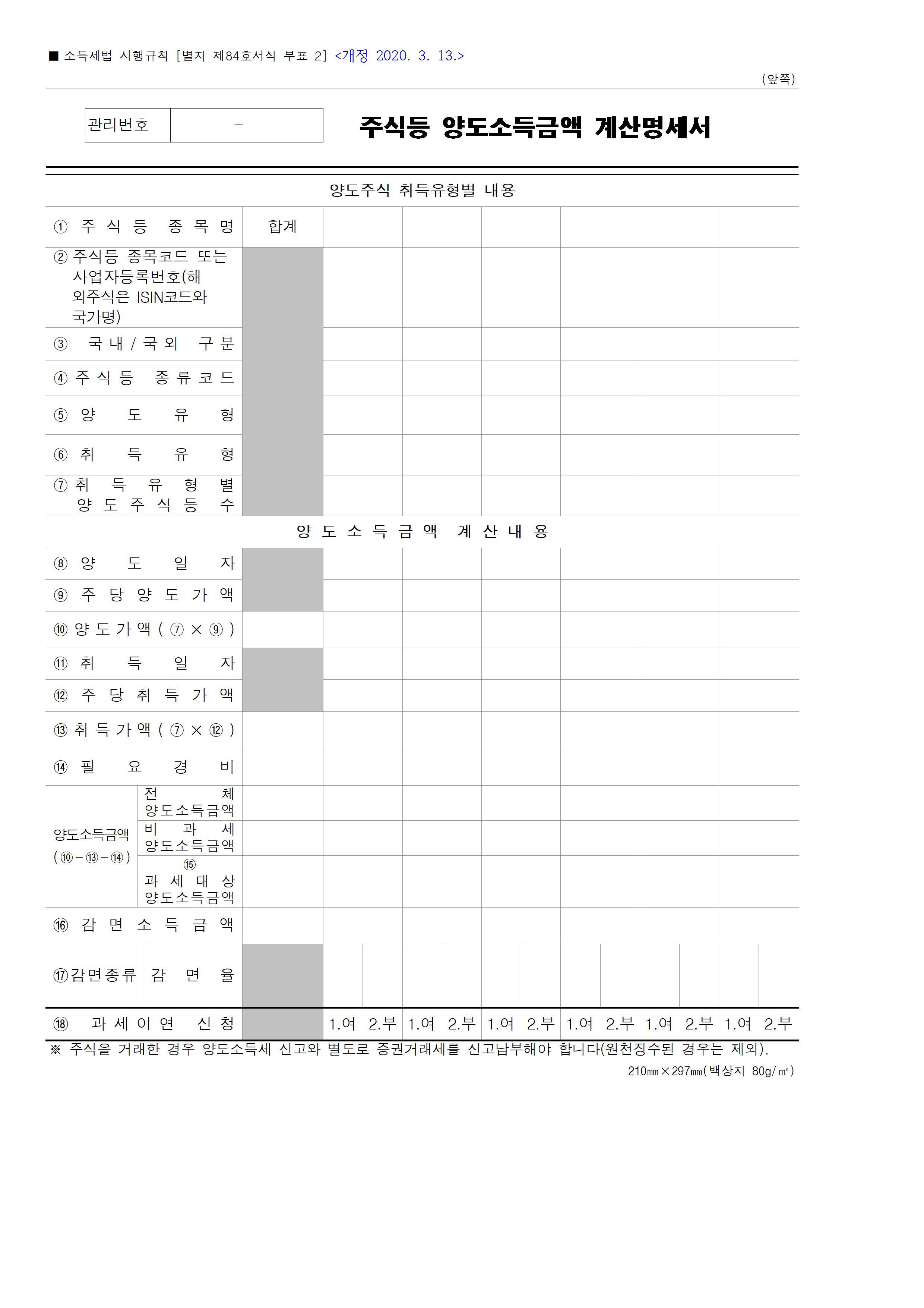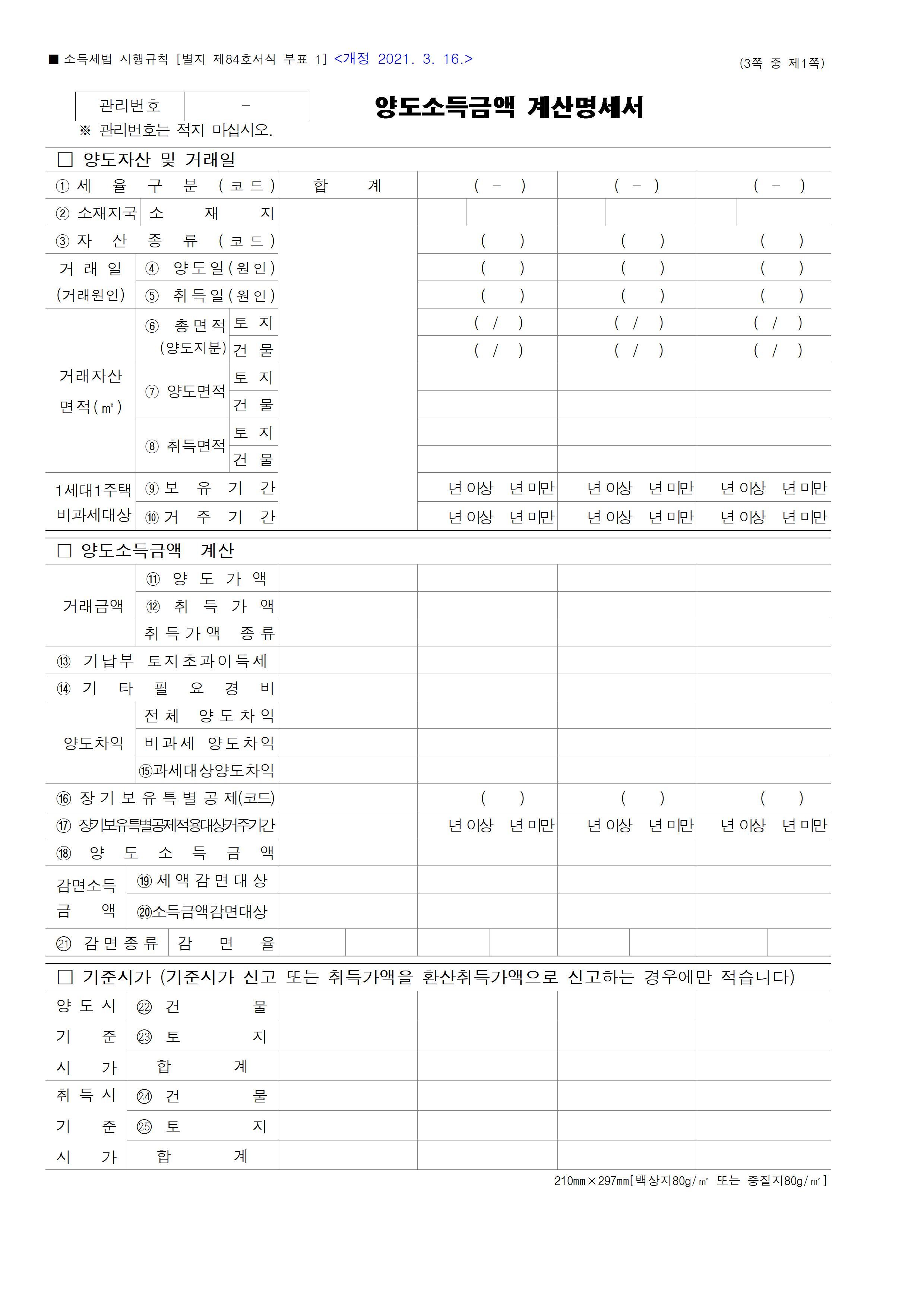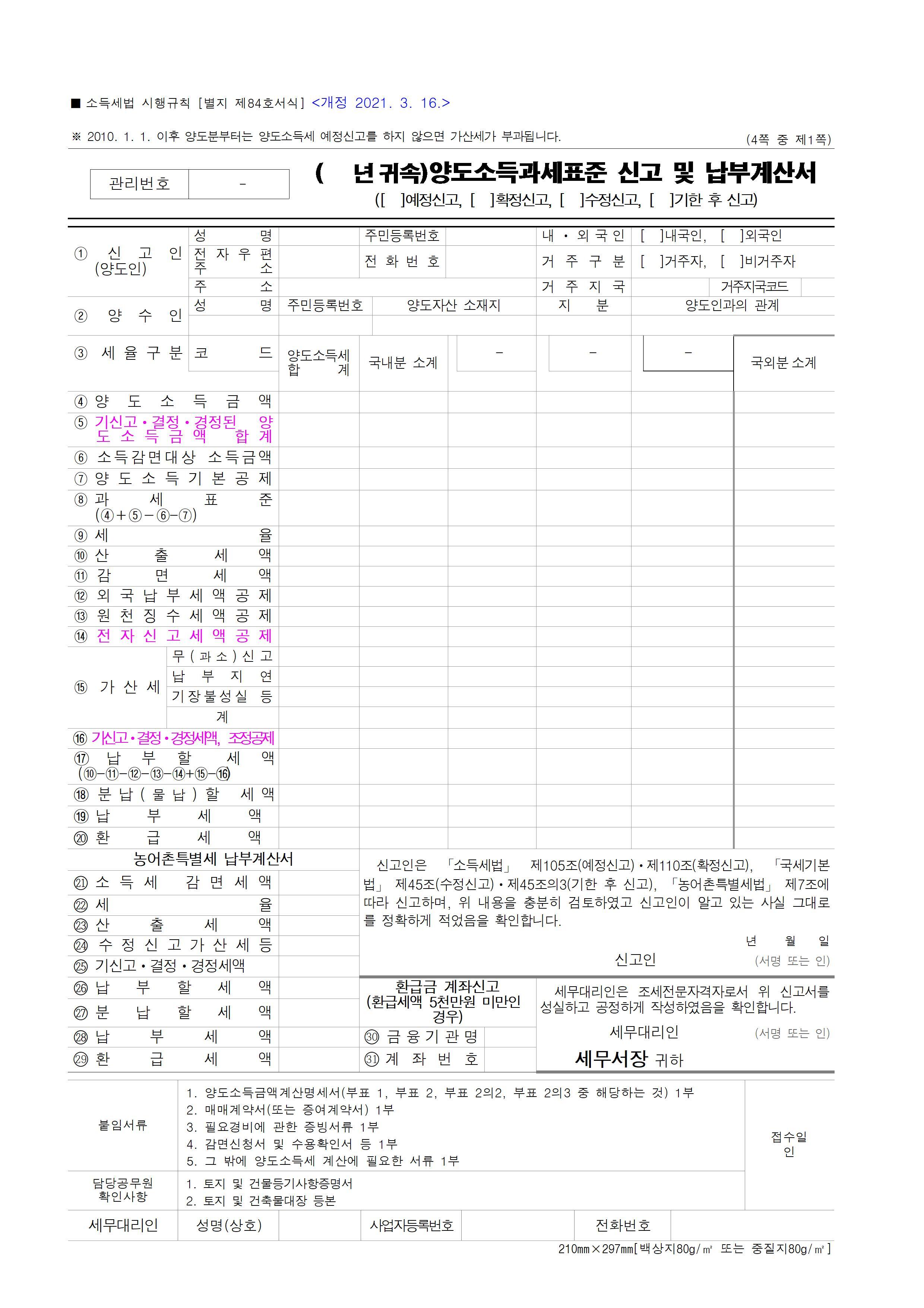 양도득세 신고서 HWP , 엑셀 (.XLSX) 소득세법 시행규칙 [별지 제84호서식] <개정 2021. 3. 16.>