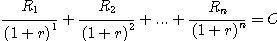 위의 수식에서 보면 R1 , R2 ,…, Rn이 현금유입이며 C는 현재시점에서의 현금유출입니다. 이때 우리가 구하고자 하는 것은 r입니다. 이런 고차원 방정식을 r에 대해 정리할 수는 없으므로 통상적으로는 수치해석적인 방법으로 구합니다. 아마 엑셀도 그런 방식으로 해를 구할 것으로 생각됩니다.