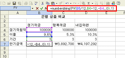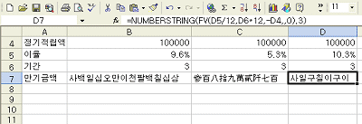 <1> 만기 금액을 구한 셀을 한글로 변경해 보도록 하겠습니다. 결과값이 나올 셀로 이동한 후 =NUMBERSTRING( 이라고 입력한 후 값이나 수식을 입력하며 표시할 Type도 입력합니다.