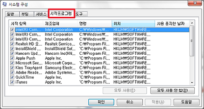 필요없는 시작프로그램을 사용 안 함으로 설정해서, 부팅 시간을 단축할 수 있다.