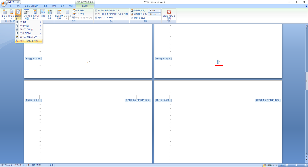 그리고나서 1구역 바닥글에 가서 페이지 번호 지우면(하나만 지워도)