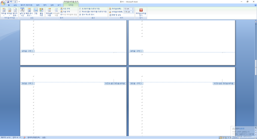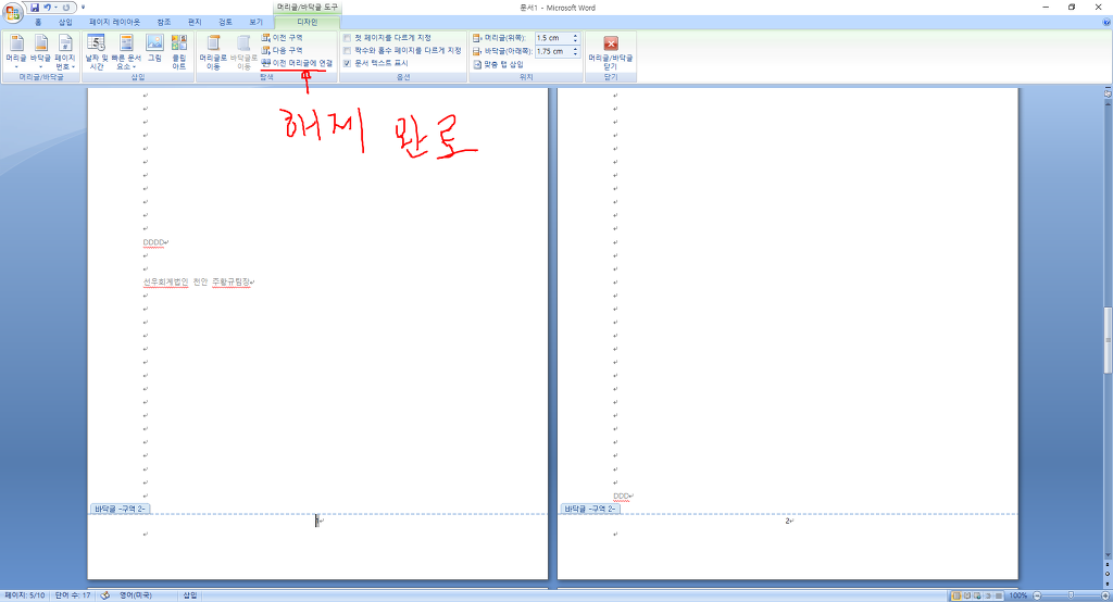 끊는 방법은 5페이지 바닥글. 즉 2구역 1페이지의 바닥글부분에 더블클릭.