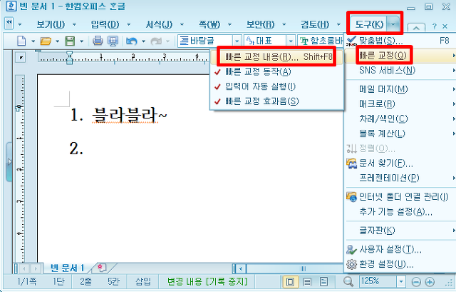 ▶ [도구] –[빠른교정] – [빠른교정내용]을 선택