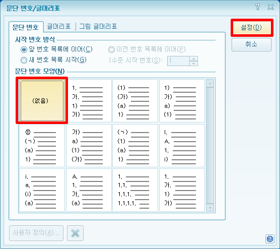 ▶ [문단 번호 모양]을 [없음]으로 선택하고 [설정]을 누르면 끝!