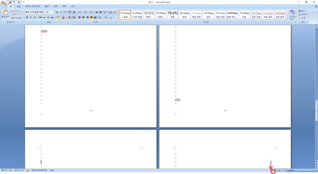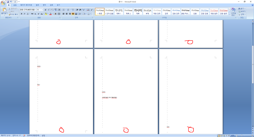 (바닥글이 보기의 기본으로 하면 안보이니 보기 > 인쇄모양을 선택하고 5페이지(바닥글을 하단 페이지번호는 "1"로 되어 있음)
