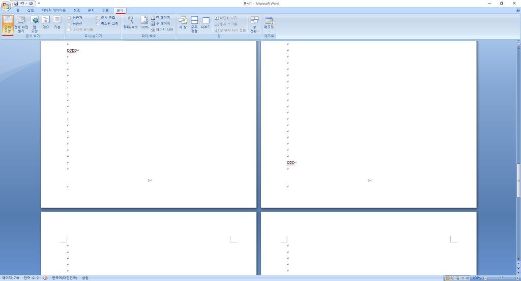실행 후 보기>인쇄모양을 선택하면 하단에 페이지번호가 순차적으로 매겨져 있는 것을 확인할 수 있다.