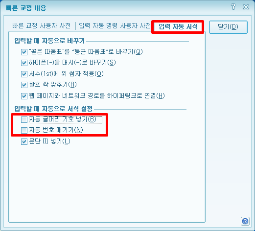 [자동 글머리 기호 넣기], [자동 번호 매기기]를 해제하고 닫기를 클릭하면 끝!