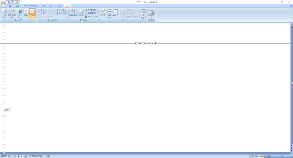 실행 후 보기>기본을 선택하면 ================ 구역 나누기(다음 페이지부터)===================가 문서상에 보인다.