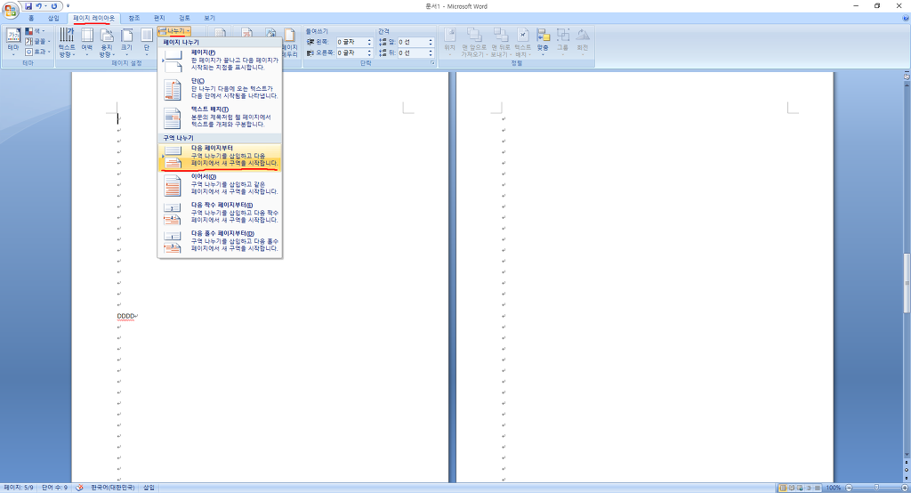 페이지 레이아웃 > 나누기 > 구역나누기 - 다음페이지부터