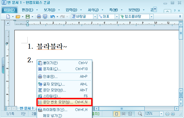 ▶ “2.” 뒤에서 오른쪽마우스 클릭 하여 [문단 번호 모양]을 선택