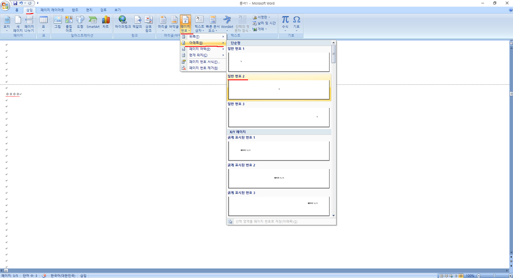 삽입>페이지 번호>아래쪽> 일반번호 2