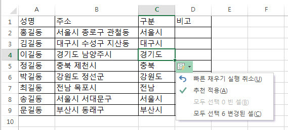 빠른 채우기를 실행해서 데이터가 입력되고 나면 아래와 같이 [C4]셀의 우측하단에 [빠른 채우기 옵션] 태그가 나타납니다.