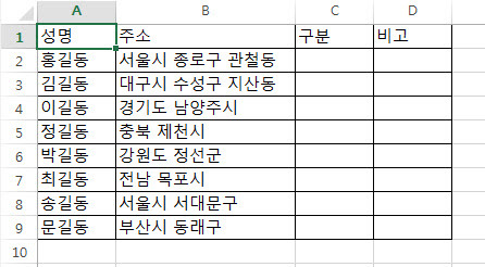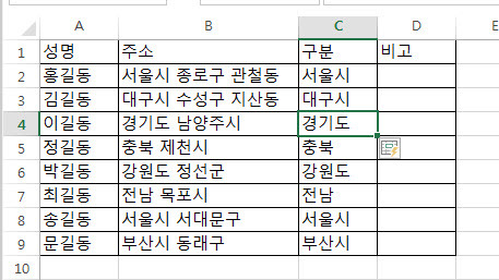 먼저 아래와 같은 데이터가 있다고 가정하고 구분(C열)이라는 곳에 각 개인별 주소의 시, 도만 표시하고자 합니다.