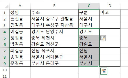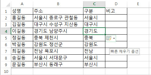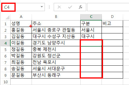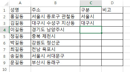 마찬가지로 '김길동'의 경우는 [C3]셀에 '대구시'라고 입력합니다.