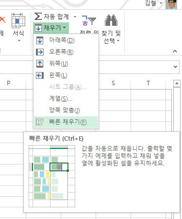 이 상태에서 리본메뉴의 [홈] 탭 - [편집] 그룹 - [채우기]를 확장해서 최하단의 [빠른 채우기]를 클릭합니다.