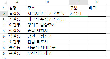 그럼 먼저 '홍길동'은 [C2]셀에 '서울시'라고 입력합니다.