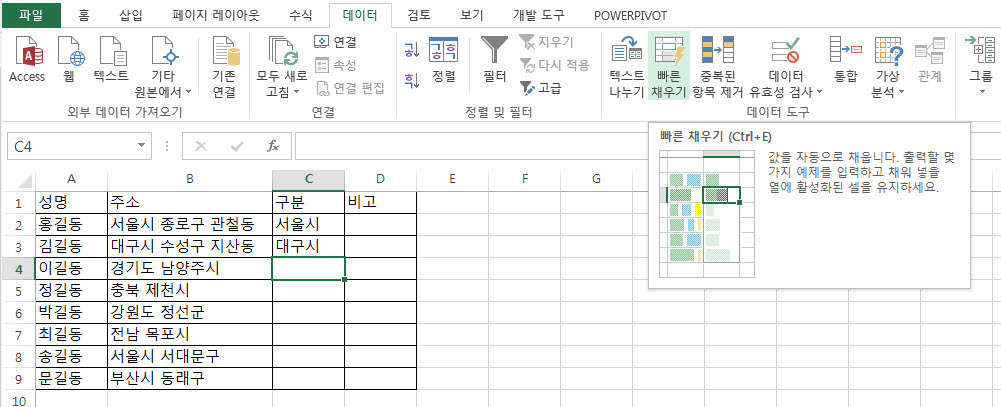 그리고 [빠른 채우기]는 [홈] 탭 - [편집] 그룹 - [채우기]에서 실행할 수도 있고 [데이터] 탭 - [데이터 도구] 그룹 - [빠른 채우기]를 이용할 수도 있습니다.