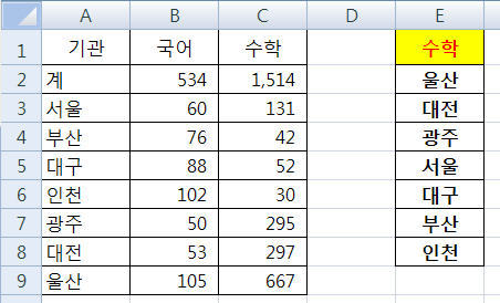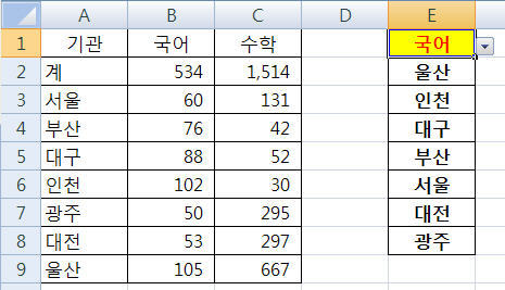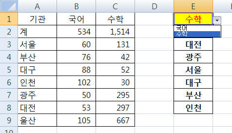 아래는 [E1]셀에서 국어를 선택했을때의 그림입니다.