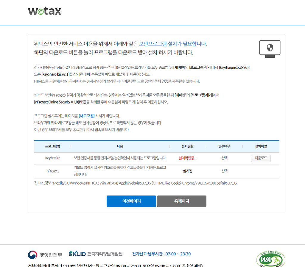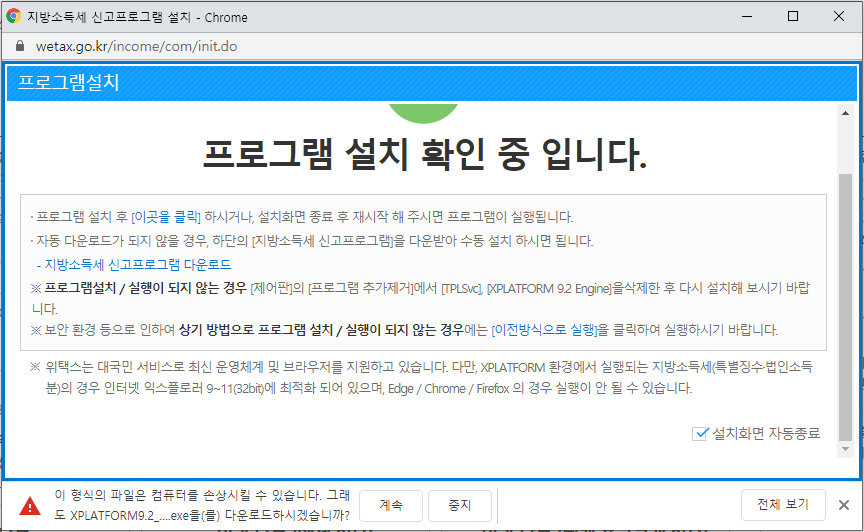 위택스는 크롬에서 특별징수 프로그램설치 후 실행이 안돼고 계속 설치하라는 메세지 뜸.