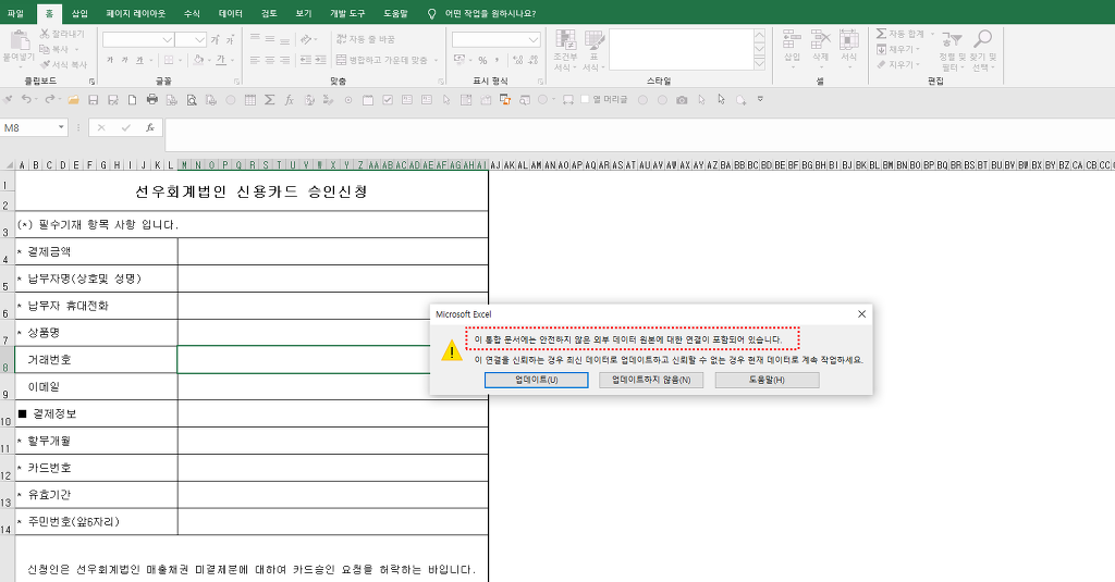 이 통합문서에는 안전하지 않은 외부 데이터 원본에 대한 연결이 포함되어 있습니다.