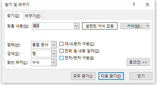 키보드 Ctrl + F 키를 눌러 [찾기 및 바꾸기] 창을 실행한 뒤, 아래와 같이 설정을 변경하여 외부링크를 검색합니다.