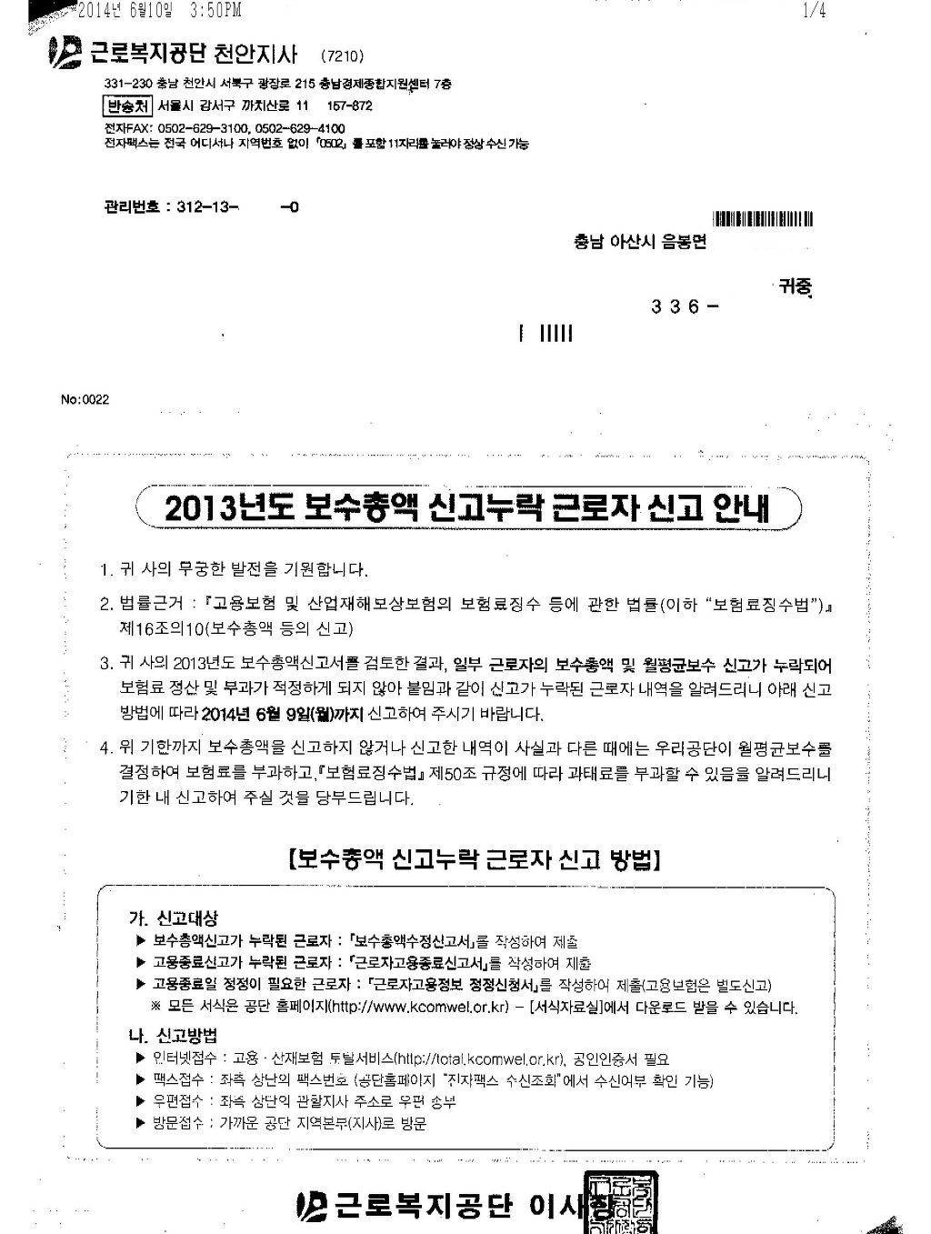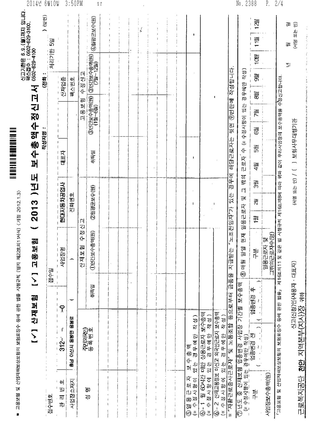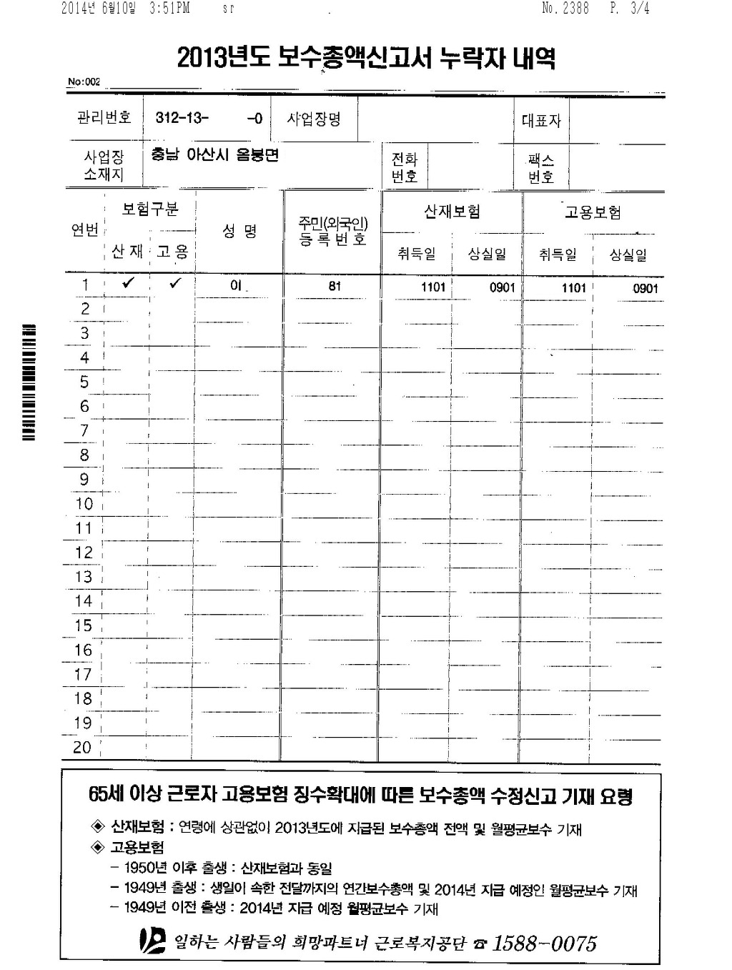 . 산재보험 : 연령에 상관없이 2013년도에 지급된 보수총액 전액 및 월평균보수 기재