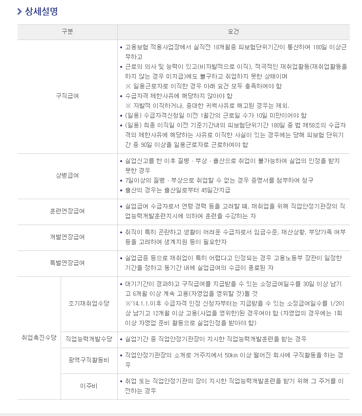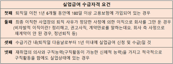 실업급여 수급자격요건 1. 퇴직일 이전 1년 6개월 동안에 180일 이상 고용보험에 가입되어 있는 경우 & 비자발적 퇴사