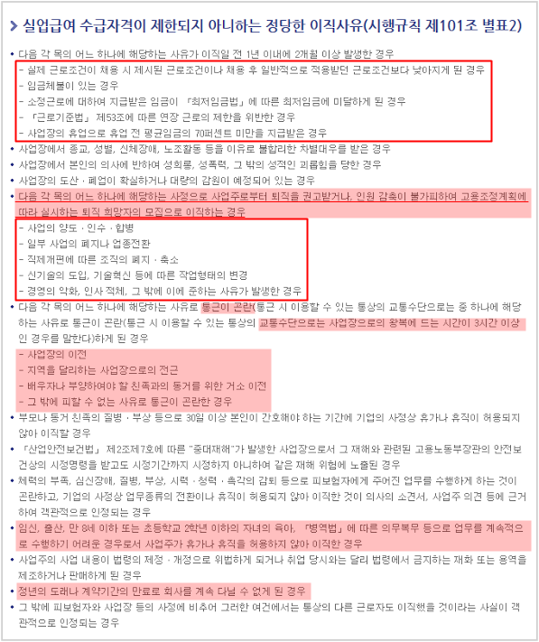 수급자격이 제한되지 아니하는 정당한 이직 사유(제101조제2항 관련) 1. 다음 각 목의 어느 하나에 해당하는 사유가 이직일 전 1년 이내에 2개월 이상 발생한 경우 가. 실제 근로조건이 채용 시 제시된 근로조건이나 채용 후 일반적으로 적용받던 근로조건보다 낮아 게 된 경우 나. 임금체불이 있는 경우 다. 소정근로에 대하여 지급받은 임금이 「최저임금법」에 따른 최저임금에 미달하게 된 경우 라. 「근로기준법」 제53조에 따른 연장 근로의 제한을 위반한 경우 마. 사업장의 휴업으로 휴업 전 평균임금의 70퍼센트 미만을 지급받은 경우 2. 사업장에서 종교, 성별, 신체장애, 노조활동 등을 이유로 불합리한 차별대우를 받은 경우 3. 사업장에서 본인의 의사에 반하여 성희롱, 성폭력, 그 밖의 성적인 괴롭힘을 당한 경우 3의2. 「근로기준법」 제76조의2에 따른 직장 내 괴롭힘을 당한 경우 4. 사업장의 도산·폐업이 확실하거나 대량의 감원이 예정되어 있는 경우 5. 다음 각 목의 어느 하나에 해당하는 사정으로 사업주로부터 퇴직을 권고받거나, 인원 감축이 불가피하여 고용조정계획에 따라 실시하는 퇴직 희망자의 모집으로 이직하는 경우 가. 사업의 양도·인수·합병 나. 일부 사업의 폐지나 업종전환 다. 직제개편에 따른 조직의 폐지·축소 라. 신기술의 도입, 기술혁신 등에 따른 작업형태의 변경 마. 경영의 악화, 인사 적체, 그 밖에 이에 준하는 사유가 발생한 경우 6. 다음 각 목의 어느 하나에 해당하는 사유로 통근이 곤란(통근 시 이용할 수 있는 통상의 교통수단으로는 사업장으로의 왕복에 드는 시간이 3시간 이상인 경우를 말한다)하게 된 경우 가. 사업장의 이전 나. 지역을 달리하는 사업장으로의 전근 다. 배우자나 부양하여야 할 친족과의 동거를 위한 거소 이전 라. 그 밖에 피할 수 없는 사유로 통근이 곤란한 경우 7. 부모나 동거 친족의 질병·부상 등으로 30일 이상 본인이 간호해야 하는 기간에 기업의 사정상 휴가나 휴직이 허용되지 않아 이직한 경우 8. 「산업안전보건법」 제2조제7호에 따른 "중대재해"가 발생한 사업장으로서 그 재해와 관련된 고용노동부장관의 안전보건상의 시정명령을 받고도 시정기간까지 시정하지 아니하여 같은 재해 위험에 노출된 경우 9. 체력의 부족, 심신장애, 질병, 부상, 시력·청력·촉각의 감퇴 등으로 피보험자가 주어진 업무를 수행하는 것이 곤란하고, 기업의 사정상 업무종류의 전환이나 휴직이 허용되지 않아 이직한 것이 의사의 소견서, 사업주 의견 등에 근거하여 객관적으로 인정되는 경우 10. 임신, 출산, 만 8세 이하 또는 초등학교 2학년 이하의 자녀(입양한 자녀를 포함한다)의 육아, 「병역법」에 따른 의무복무 등으로 업무를 계속적으로 수행하기 어려운 경우로서 사업주가 휴가나 휴직을 허용하지 않아 이직한 경우 11. 사업주의 사업 내용이 법령의 제정·개정으로 위법하게 되거나 취업 당시와는 달리 법령에서 금지하는 재화 또는 용역을 제조하거나 판매하게 된 경우 12. 정년의 도래나 계약기간의 만료로 회사를 계속 다닐 수 없게 된 경우 13. 그 밖에 피보험자와 사업장 등의 사정에 비추어 그러한 여건에서는 통상의 다른 근로자도 이직했을 것이라는 사실이 객관적으로 인정되는 경우 |
