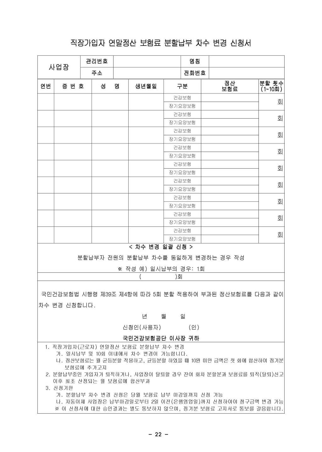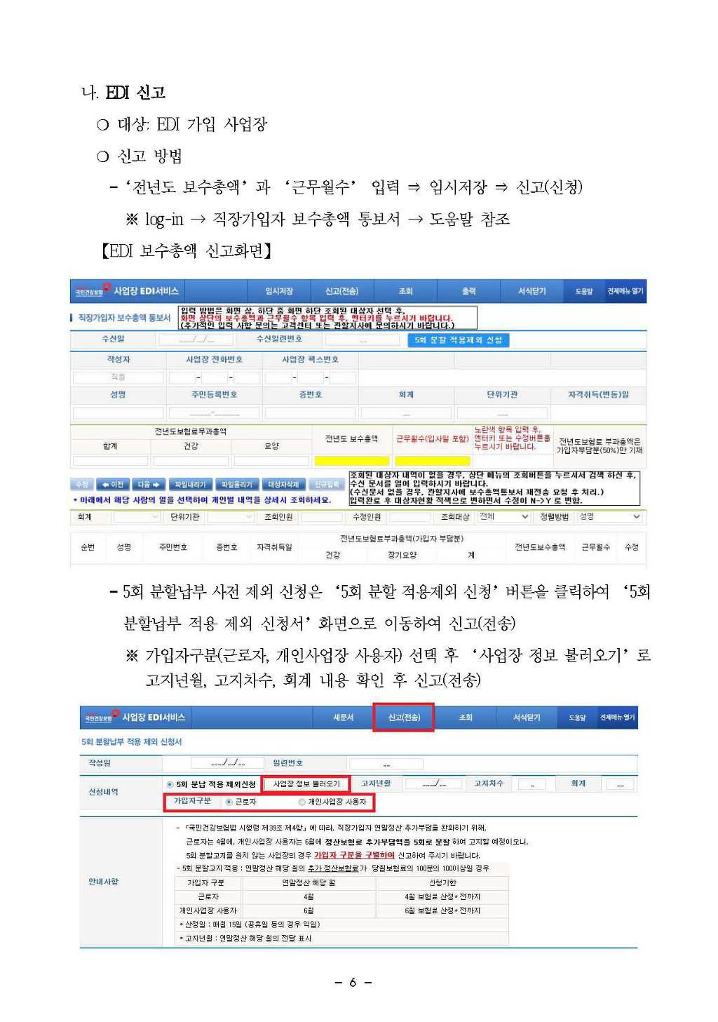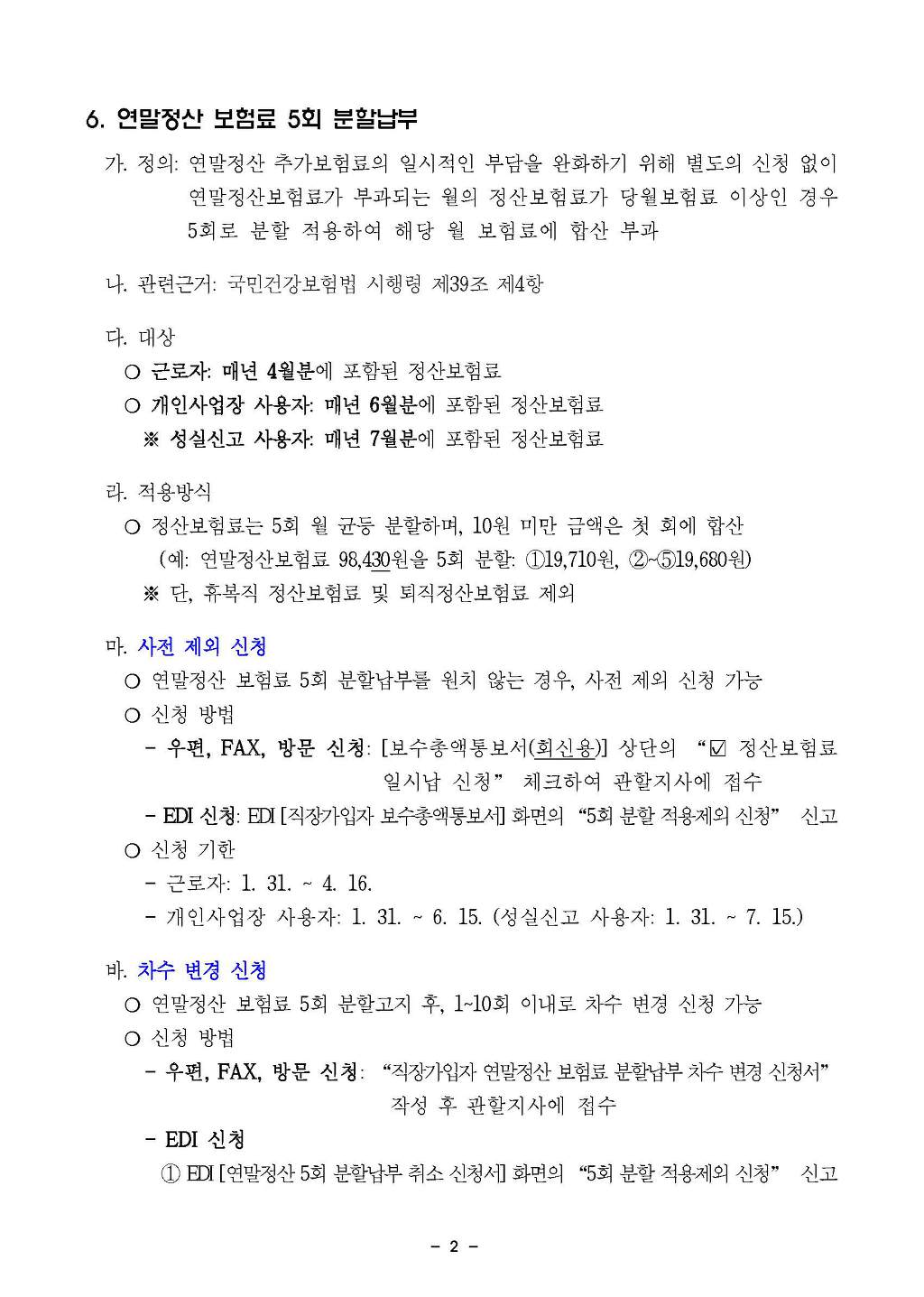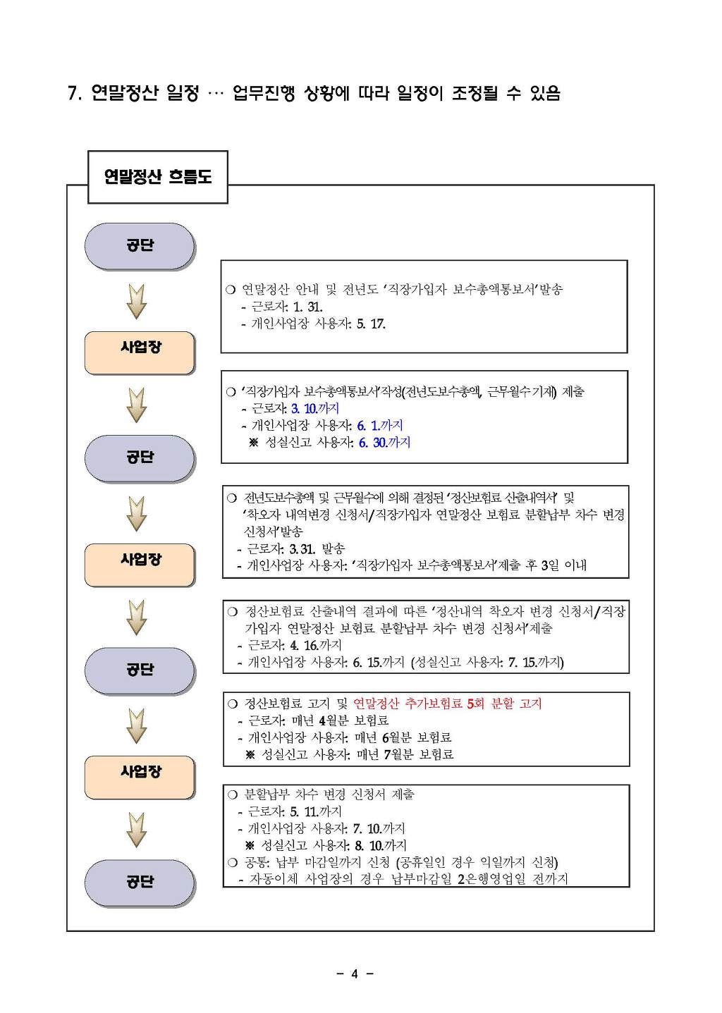 보수총액 신고 안내 「보수총액통보서」 발송 (공단⇒사업장) | 보수총액 신고 「보수총액통보서」 제출 (사업장⇒공단) | 연말정산보험료 안내 「산출내역서」 발송 (공단⇒사업장) | 연말정산 착오자 변경 신고, 5회 분납 사전 제외 신청 (사업장⇒공단) | 연말정산 보험료 부과 연말정산 추가보험료 5회 분할고지 |
