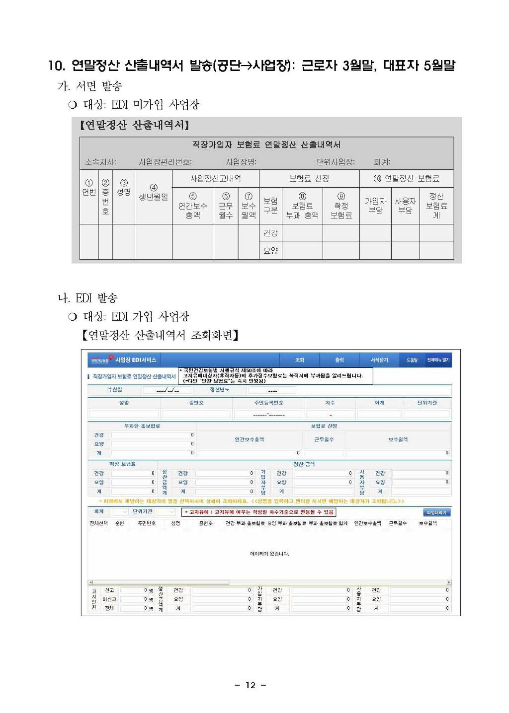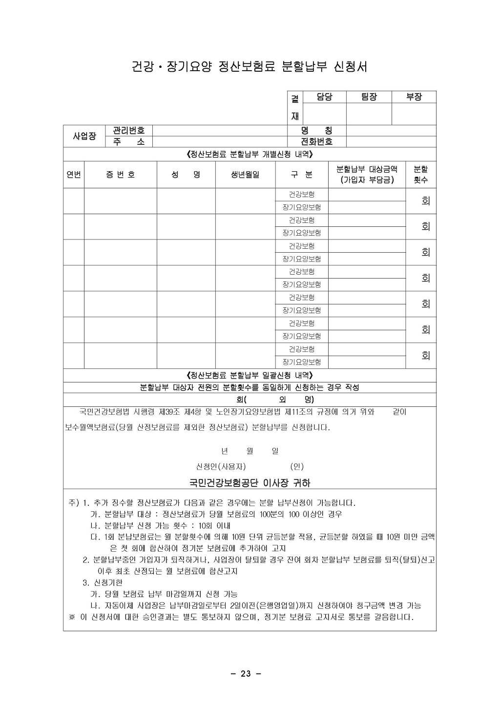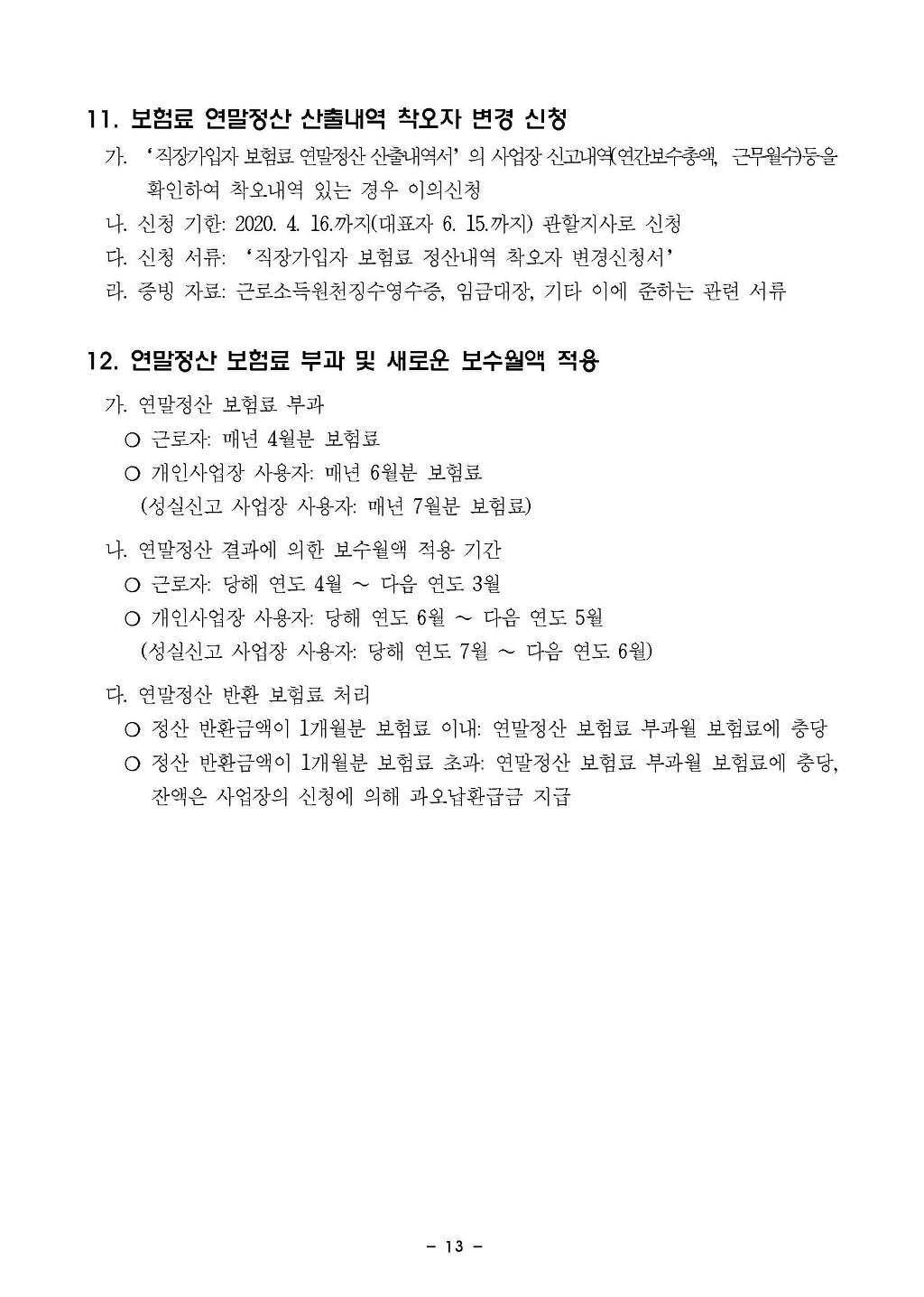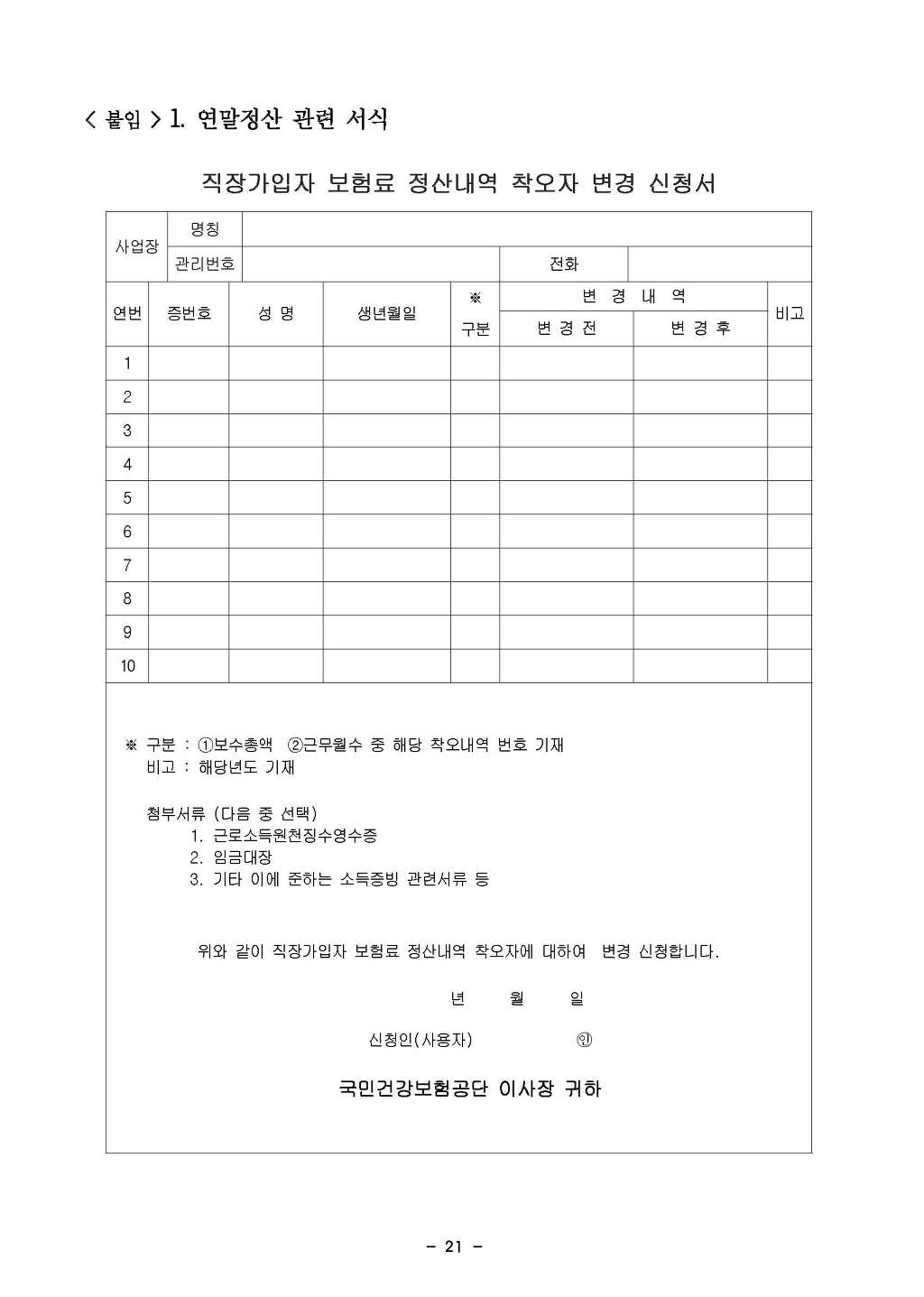 보수총액 신고 안내 「보수총액통보서」 발송 (공단⇒사업장) | 보수총액 신고 「보수총액통보서」 제출 (사업장⇒공단) | 연말정산보험료 안내 「산출내역서」 발송 (공단⇒사업장) | 연말정산 착오자 변경 신고, 5회 분납 사전 제외 신청 (사업장⇒공단) | 연말정산 보험료 부과 연말정산 추가보험료 5회 분할고지 |