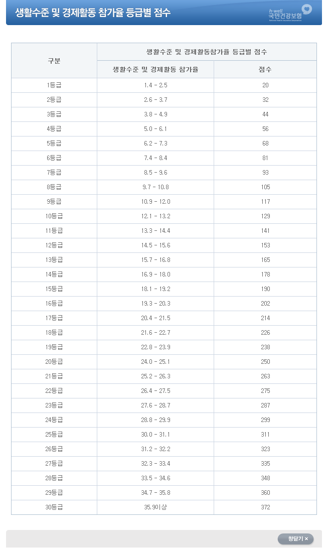생활수준 및 경제활동 참가율 등급별 점수
